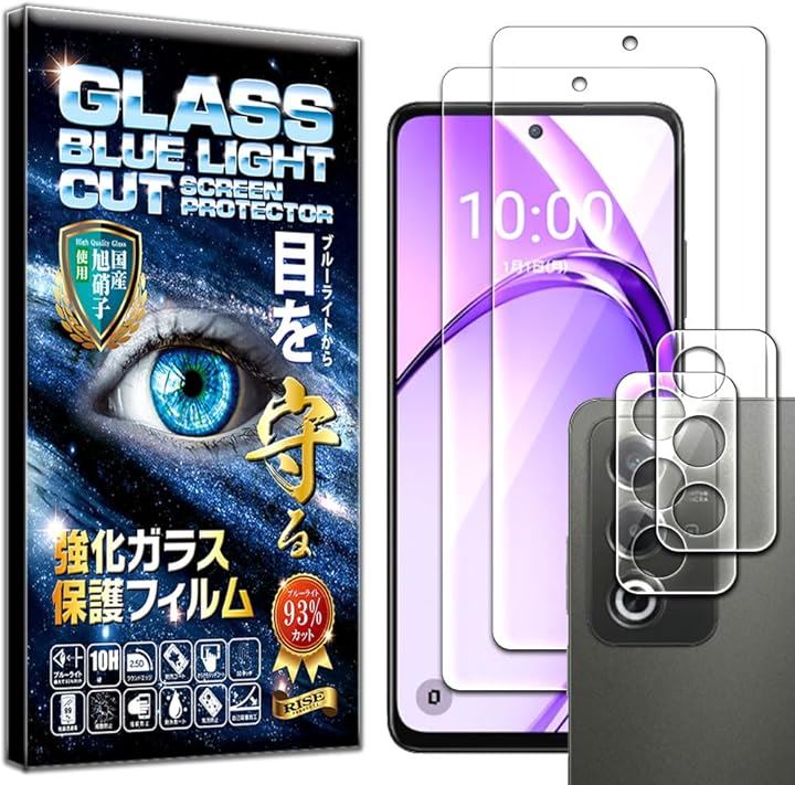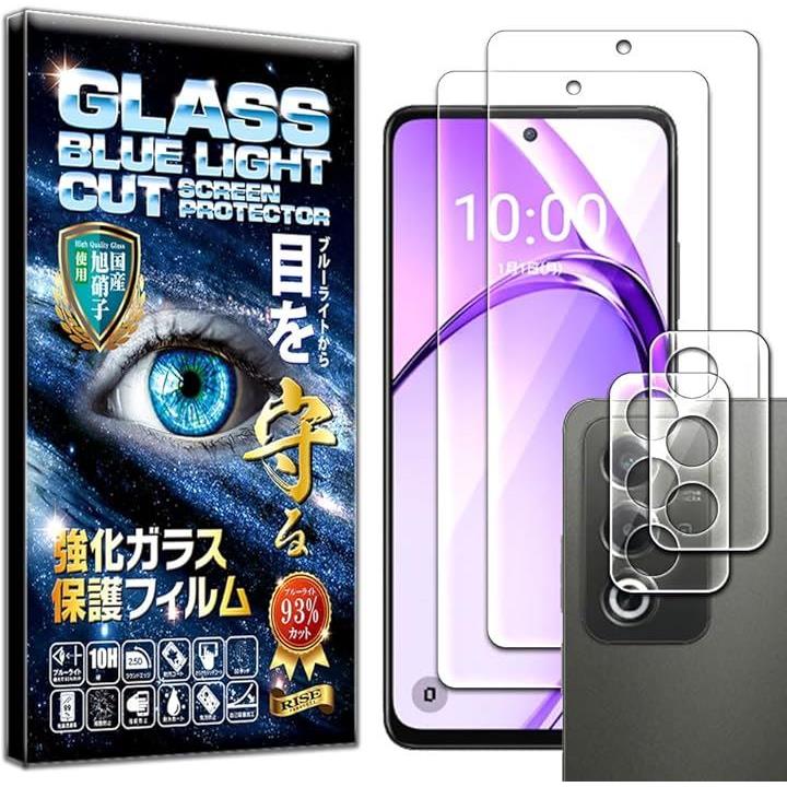RISE 2枚+2枚 フィルム OPPO A3 5G ガラスフィルム ブルーライトカット カメラフィルム レンズフィルム レンズ保護ガラス レンズカバー 保護フィルム 強化 高透過 高光沢 日本製 旭硝子 0.26mm 硬度10H 2.5Dラウンドエッジ 自動吸着 気泡ゼロ 飛散防止
