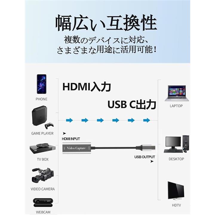 互換品 USB-C HDMIキャプチャーボード UVC対応 小型軽量 電源不要 4Kパススルー&HD1080P/60Hz録画対応 HDMI変換アダプタ ゲーム実況/ライブ配信