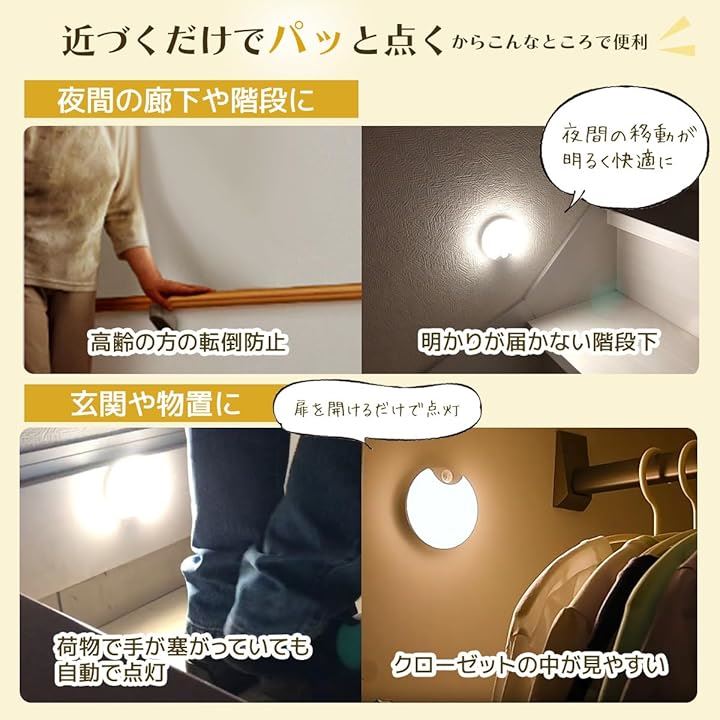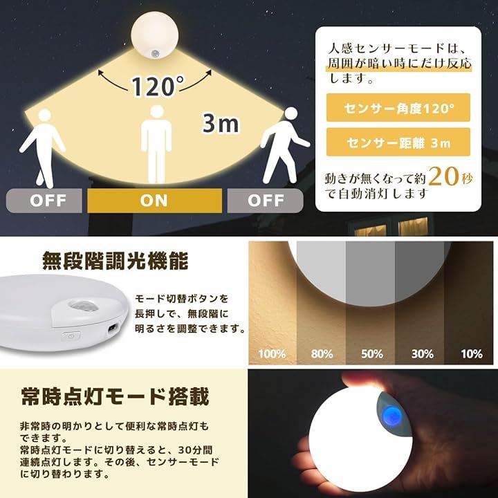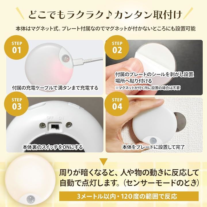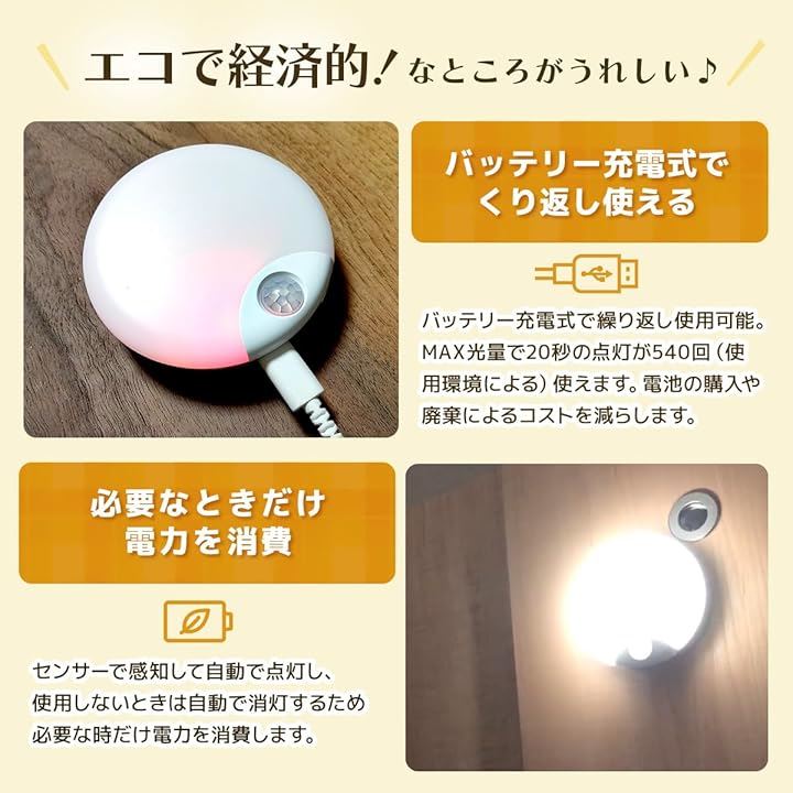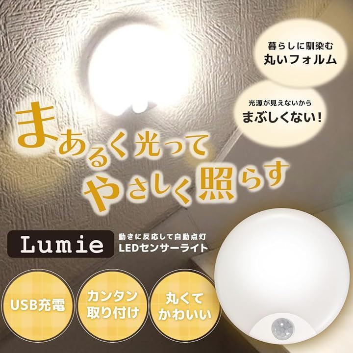やさしく光る丸型ライト 人感センサー Lumie ルミエ 充電式 取り付けカンタン 明るさも調整できる 手のひらサイズの8cm マグネット typeC充電 省エネ