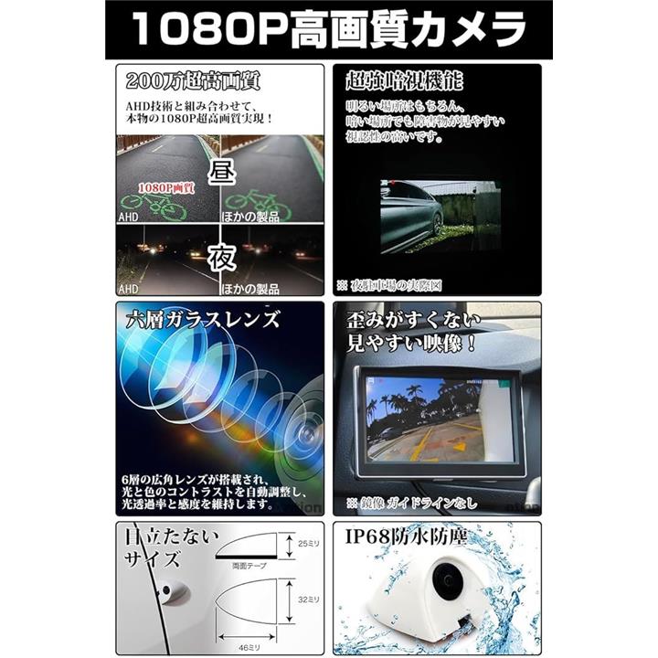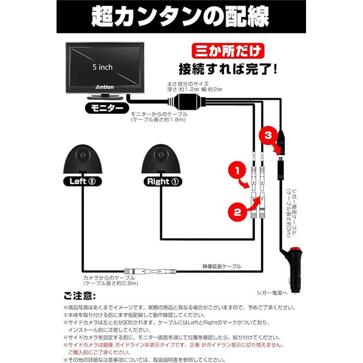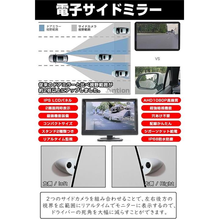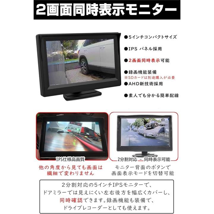 5インチモニター 2個サイドカメラセット AHD1080P IPS液晶モニター ドアミラー死角確認 リアルタイム監視 録画機能あり 車載カメラ 200万画素 最低照度0.01Lux 暗視機能搭載 防水防塵 穴あけ不要 運転支援システム 配線簡単 12V 日本語説明書付き