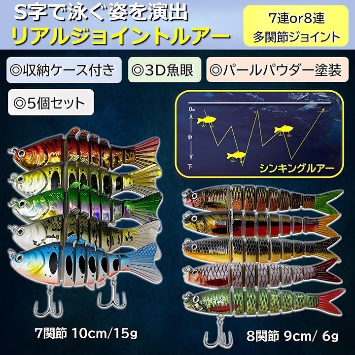 ジョイントルアー スローシンキング 5個セット 本物そっくり 多関節 デザイン リアル 釣り 海釣り 川釣り バス釣り ロックフィッシュ トラウト シーバス ヒラメ 海水 淡水