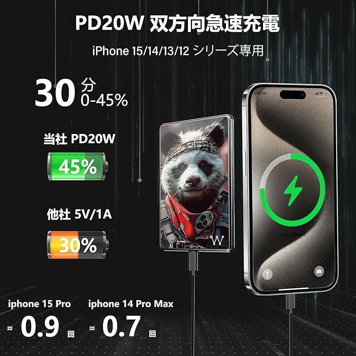 「PD20Wパススルー充電」20W USB-Cポート搭載のマグネット式モバイルバッテリー5000mAhは、iPhone 15 Proをわずか30分で50%まで急速充電できます。