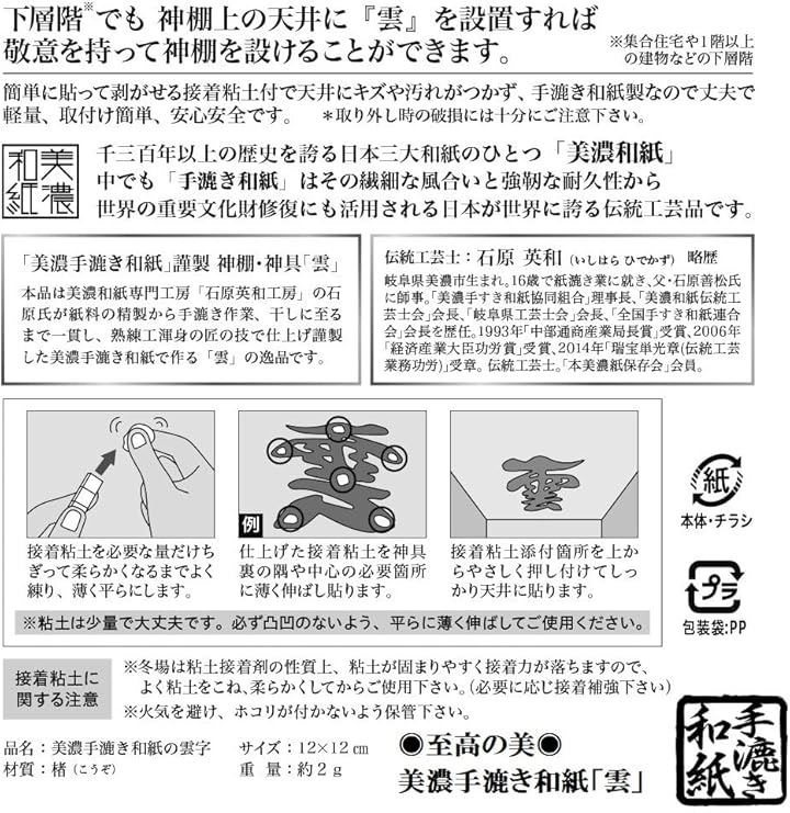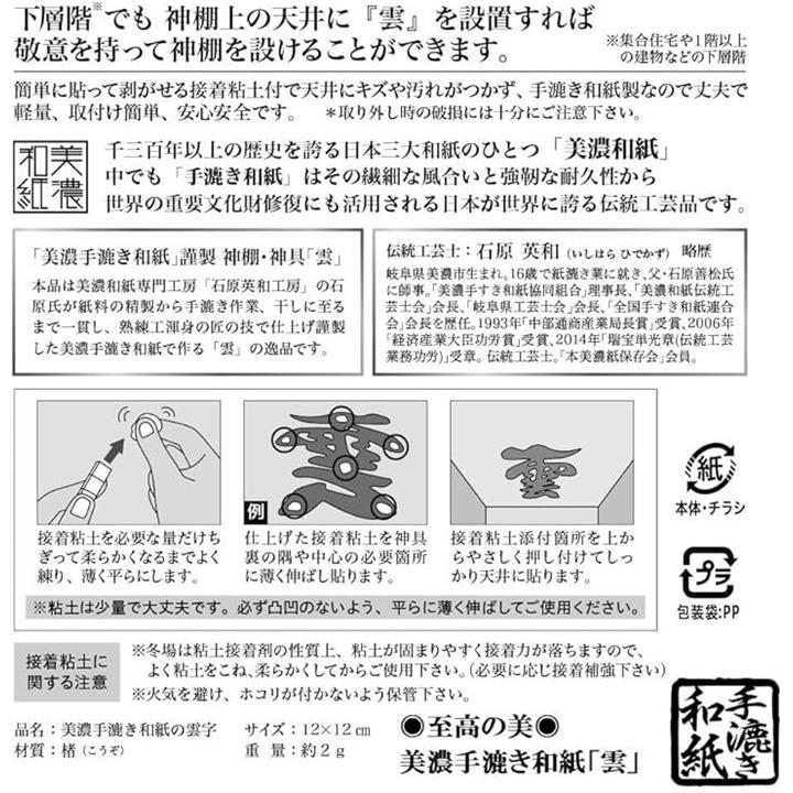 雲 美濃和紙 雲字 雲切 神棚 神具 仏壇 仏具 手漉き 12x12cm 雲切り 文字 日本製 簡単設置 接着粘土付き