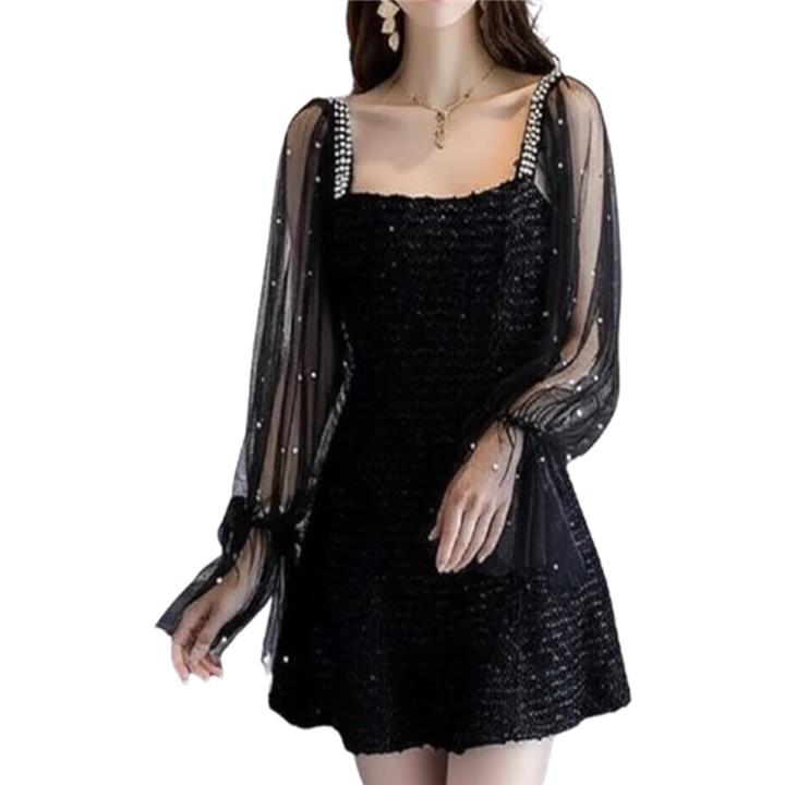 シースルー シフォンスリーブ パールビジュー スクウェア ミニワンピース フレアスカート 着痩せ 膝丈ミニドレス キャバドレス