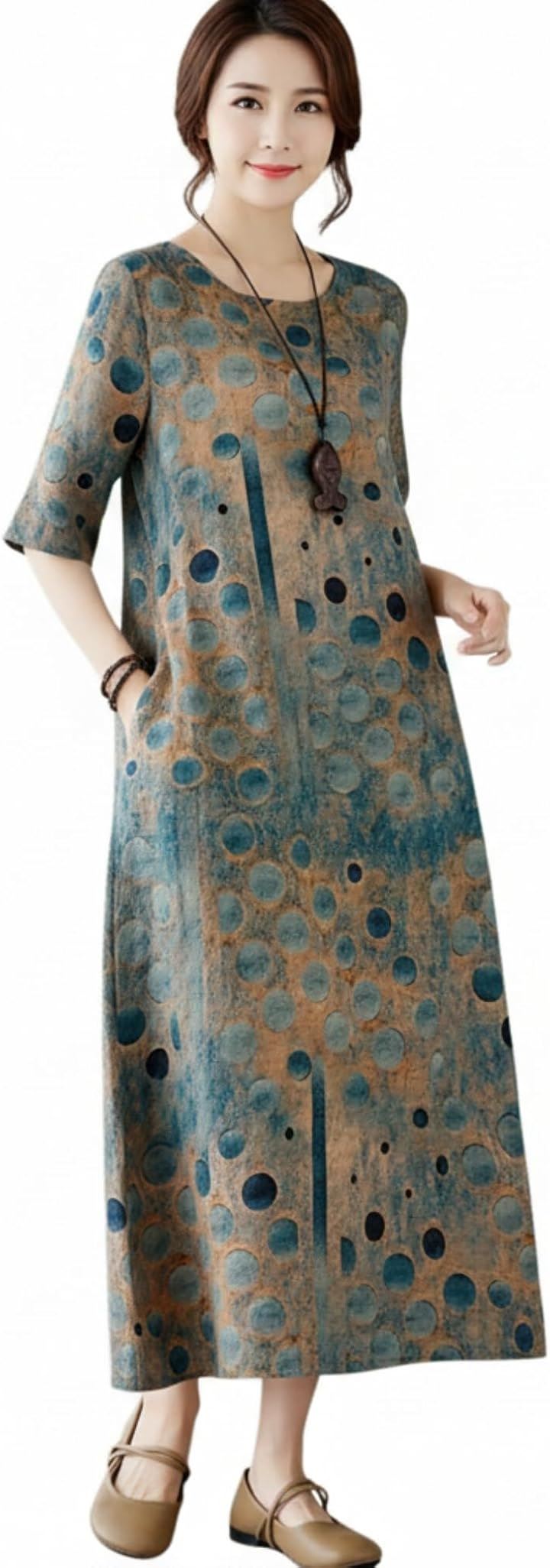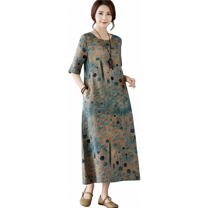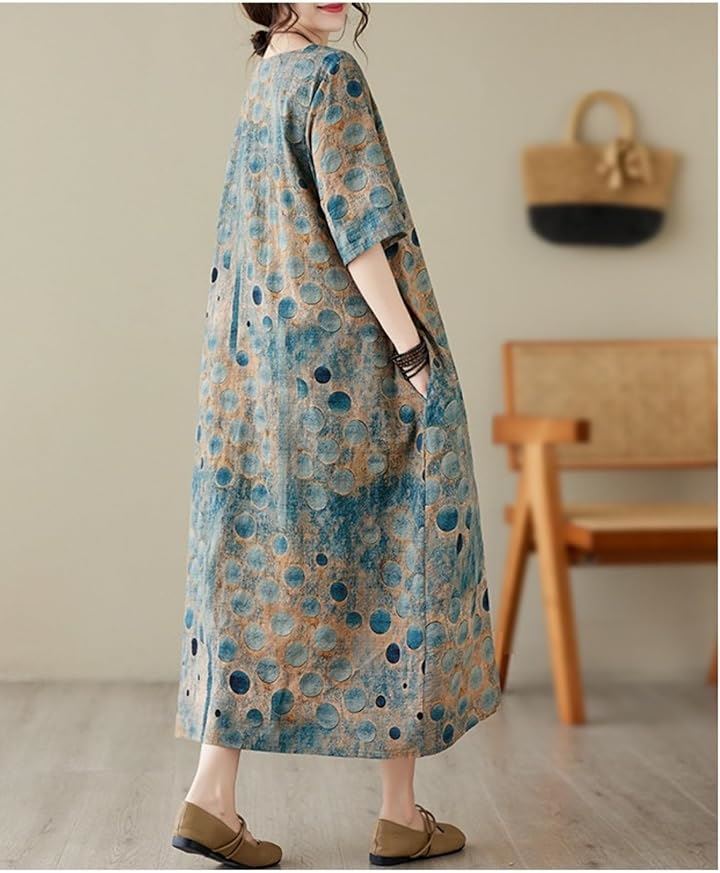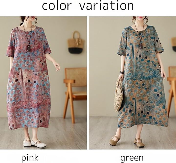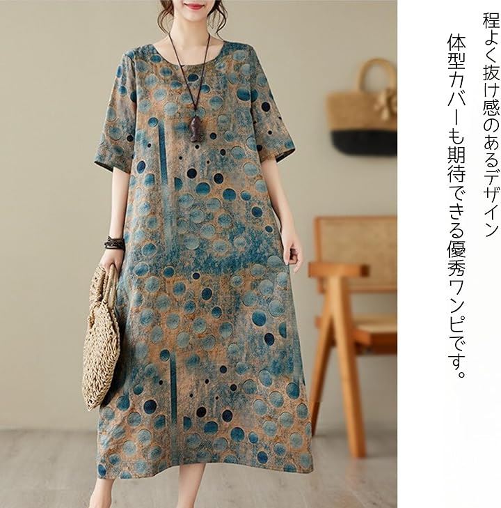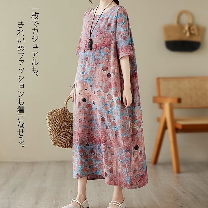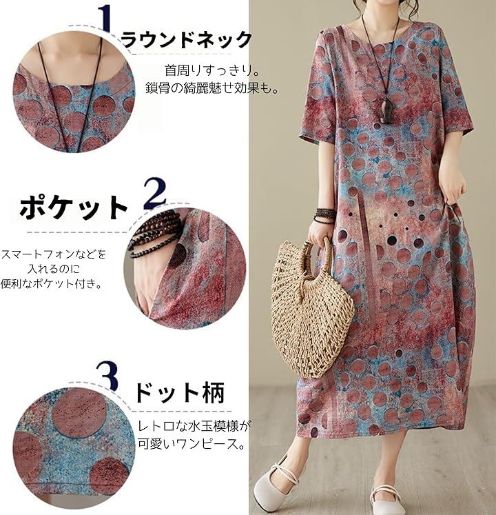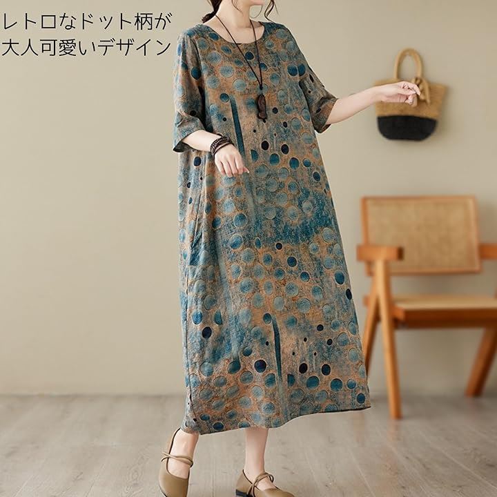 ロング丈 ワンピ カジュアル 半袖 夏 きれいめプリント サイドポケット クルーネック ロングチュニック 体型カバー 可愛い ルーズフィット ドット