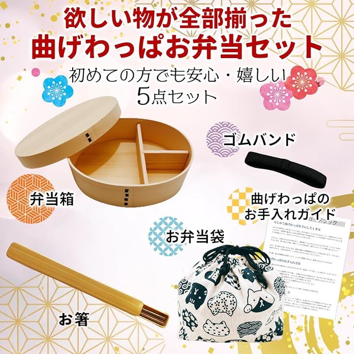 「初心者にお勧め。買い足し不要の5点セット。」「白木調まげわっぱ」「お箸」「巾着」「ランチバンド」「お手入れガイドブック」の豪華5点セット。買い足し不要ですぐに曲げわっぱデビュー*