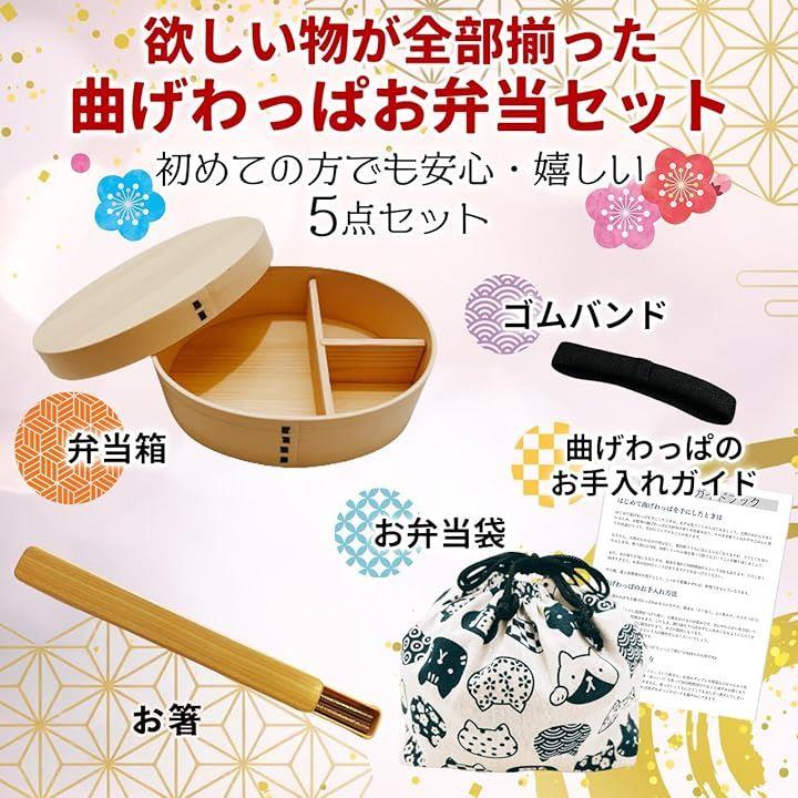 「5点セット」 曲げわっぱ 白木(柳杉)お箸 バッグ 巾着 ガイド 弁当箱一式セット 抗菌 わっぱ 保湿 まげわっぱ わっぱ 曲げ輪っぱ おしゃれ (バッグ付き キャット) |
