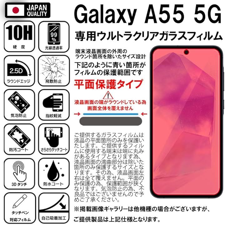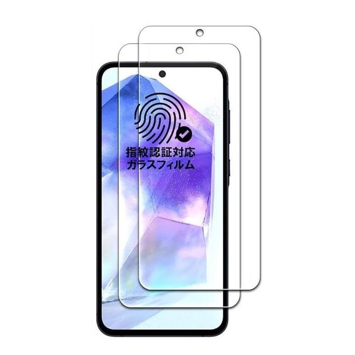 指紋認証対応2枚セットフィルム Galaxy ギャラクシー A55 5G SC-53E SCG27 用 ガラスフィルム 保護フィルム 強化 高透過 高光沢 日本製 硬度10H 2.5Dラウンドエッジ 3D タッチ