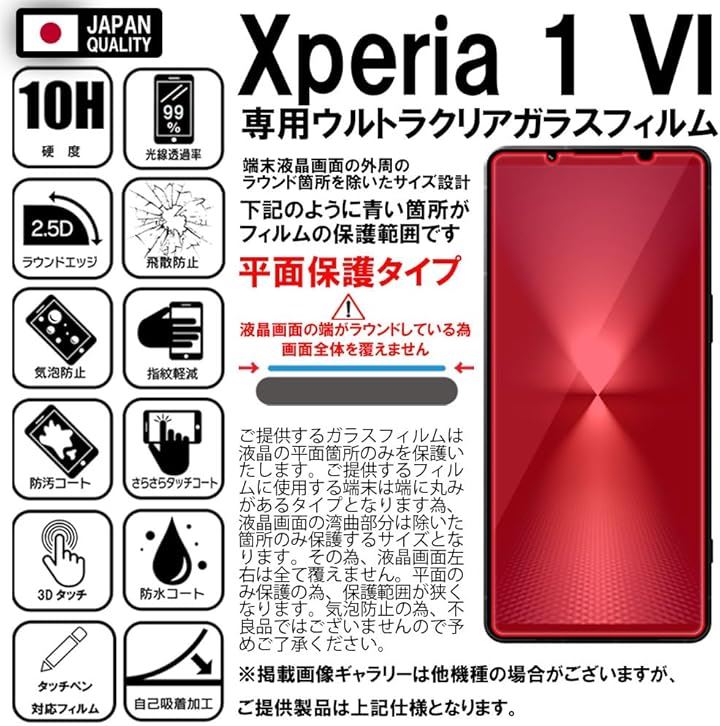 指紋認証対応2枚セットフィルム Xperia 1 VI SO-51E 用 ガラスフィルム 保護フィルム 強化 高透過 高光沢 日本製 硬度10H 2.5Dラウンドエッジ 自動吸着 気泡ゼロ 飛散防止 指紋防止 撥水撥油 3D タッチ