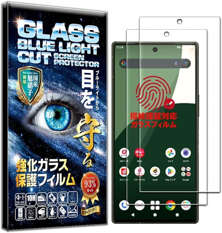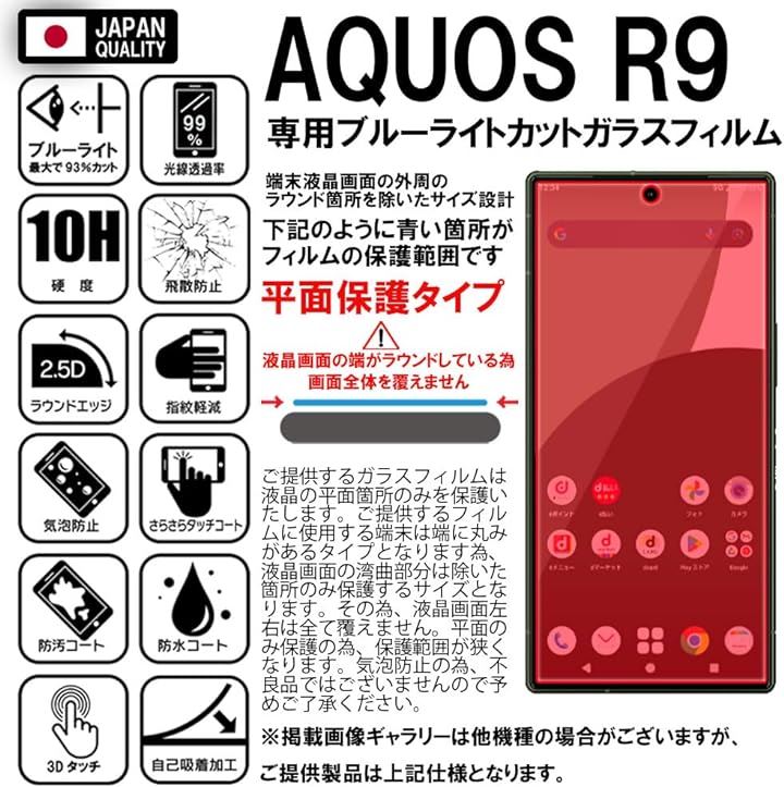 指紋認証対応2枚セットフィルム AQUOS R9 SH-51E 用 ガラスフィルム ブルーライトカット 93% 保護フィルム 強化 高透過 高光沢 日本製 旭硝子 硬度10H 2.5Dラウンドエッジ 自動吸着 気泡ゼロ 飛散防止 指紋防止 撥水撥油
