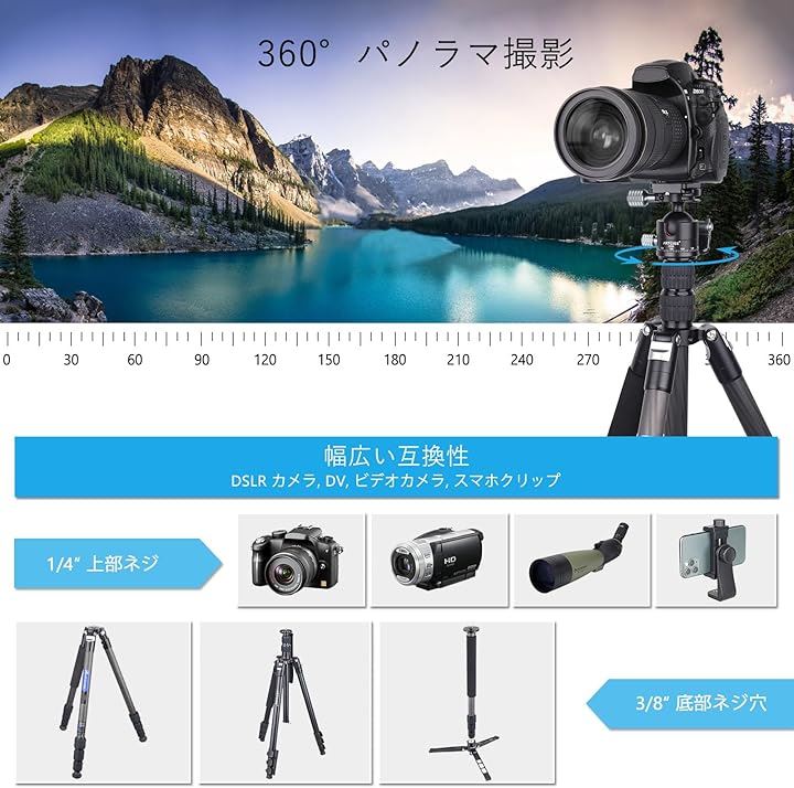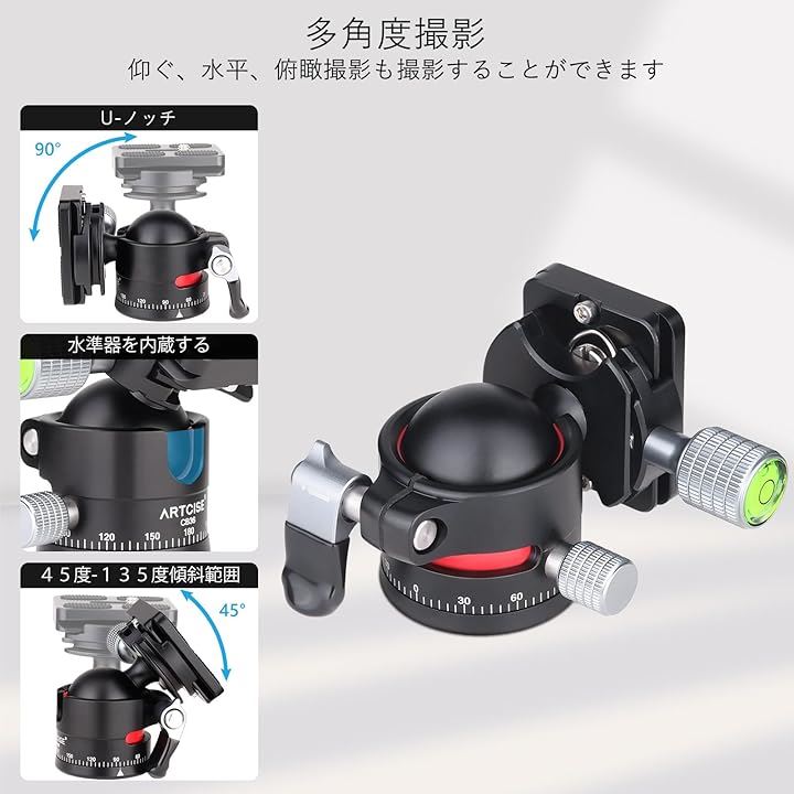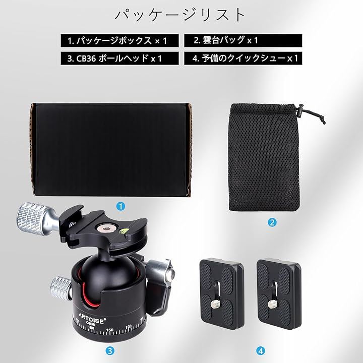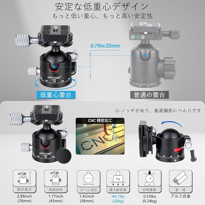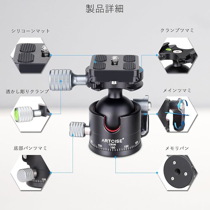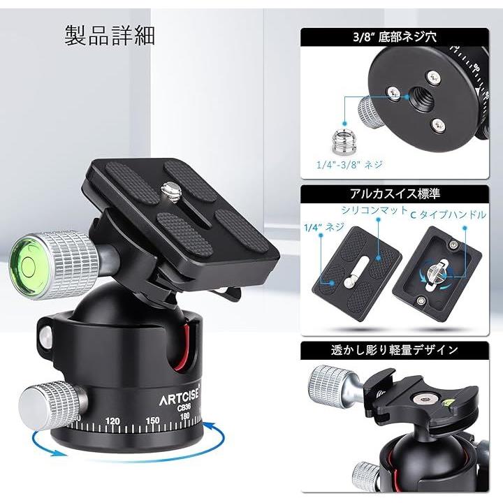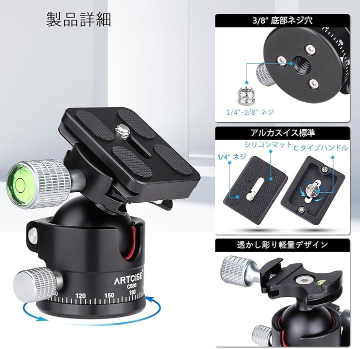 互換品 アルカスイス互換 36mm 低重心 ボール雲台 CNC加工 アルミ 360度回転 パノラマパン クイックシュー 三脚ヘッド 自由雲台 一眼レフ DSLR ビデオカメラ用 最大耐荷重 20キロ