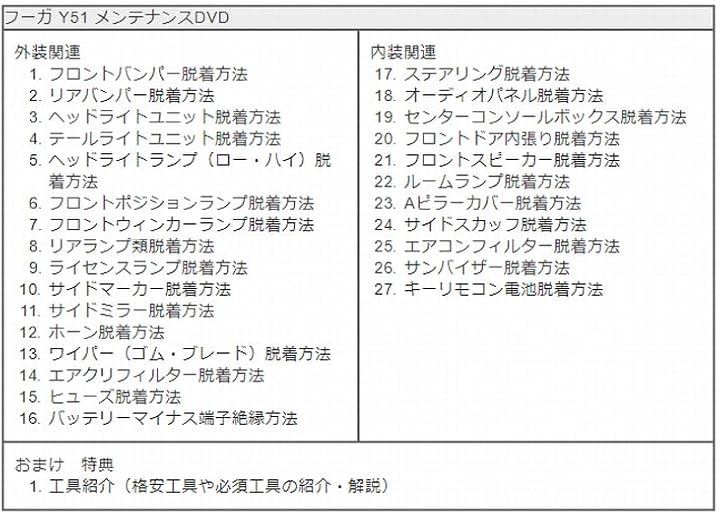 フーガ Y51 DVD収録内容:*外装関連*1. フロントバンパー脱着方法 2. リアバンパー脱着方法 3. ヘッドライトユニット脱着方法 4. テールライトユニット脱着方法 5. ヘッドライトランプ(ロー・ハイ)脱着方法 6. フロントポジションランプ脱着方法 7. フロントウィンカーランプ脱着方法 8. リアランプ類脱着方法 9. ライセンスランプ脱着方法 10. サイドマーカー脱着方法 11. サイドミラー脱着方法 12. ホーン脱着方法 13. ワイパー(ゴム・ブレード)脱着方法 14. エアクリフィルター脱着方法 15. ヒューズ脱着方法 16. バッテリーマイナス端子絶縁方法