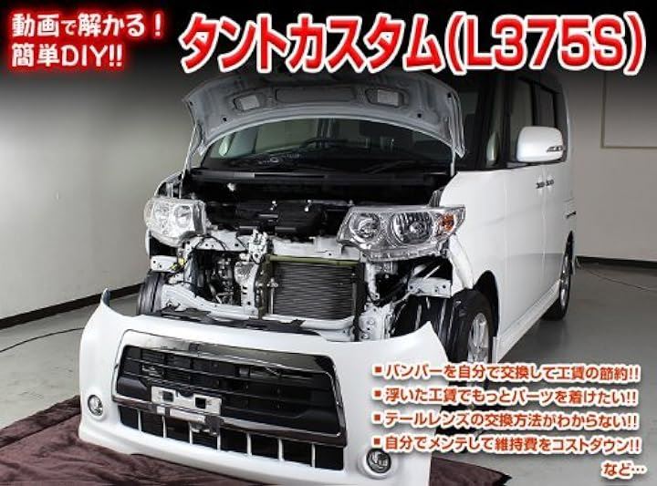 ・ジャッキアップ方法の解説やエンジンオイル交換方法・ライト交換方法・ フロント(リア)バンパー交換方法・内張り交換方法などなど、タントカスタム(L375S)の 各種パーツの取外し方法や取付け方法、改造やチューニングを解説したDVDです。