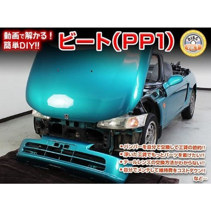 ビート(PP1)DVD収録内容:外装関連 1. ジャッキアップ&ダウン方法 2. エンジンオイル交換方法 3. フロントバンパー脱着方法 4. リアバンパー脱着方法 5. ヘッドライトユニット脱着方法 6. テールライトユニット脱着方法 7. ヘッドライトランプ(ロー・ハイ)脱着方法 8. フロントポジションランプ脱着方法 9. フロントウィンカーランプ脱着方法 10. リアランプ類脱着方法 11. ライセンスランプ脱着方法 12. サイドマーカー脱着方法 13. ホーン脱着方法 14. ワイパー(ゴム・ブレード)脱着方法 15. バッテリーマイナス端子絶縁方法 16. バッテリー脱着方法