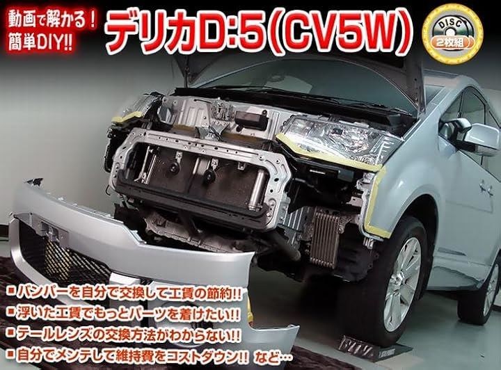 デリカ D5 (CV5W) DVD 収録内容 : [外装関連] 1. ジャッキアップ&ダウン方法 2. エンジンオイル交換方法 3. フロントグリル脱着方法 4. フロントバンパー脱着方法 5. リアバンパー脱着方法 6. ヘッドライトユニット脱着方法 7. テールライトユニット脱着方法 8. リアライトユニット脱着方法 9. マフラー脱着方法 10. ヘッドライトランプ(ロー)脱着方法 11. ヘッドライトランプ(ハイ)脱着方法 12. フロントポジションランプ脱着方法 13. フロントウィンカーランプ脱着方法 14. アクティブコーナリングランプ脱着方法 15. リアランプ類脱着方法 16. バックランプ脱着方法 17. ハイマウントストップランプ脱着方法 18. ワイパー(ゴム・アーム)脱着方法 19. エアクリフィルター脱着方法 20. ホーン脱着方法 21. ライセンスランプ脱着方法 22. バッテリーマイナス端子絶縁方法