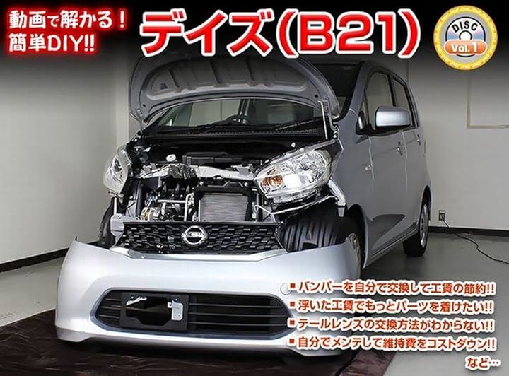 ・電球交換解説(バルブ・ウィンカーランプなど)バンパー交換方法・ヘッドライト交換方法・フロンドドア内張り脱着方法などなど、デイズ(B21) のメンテナンス・各種パーツ交換方法・脱着方法を解説したDVD。