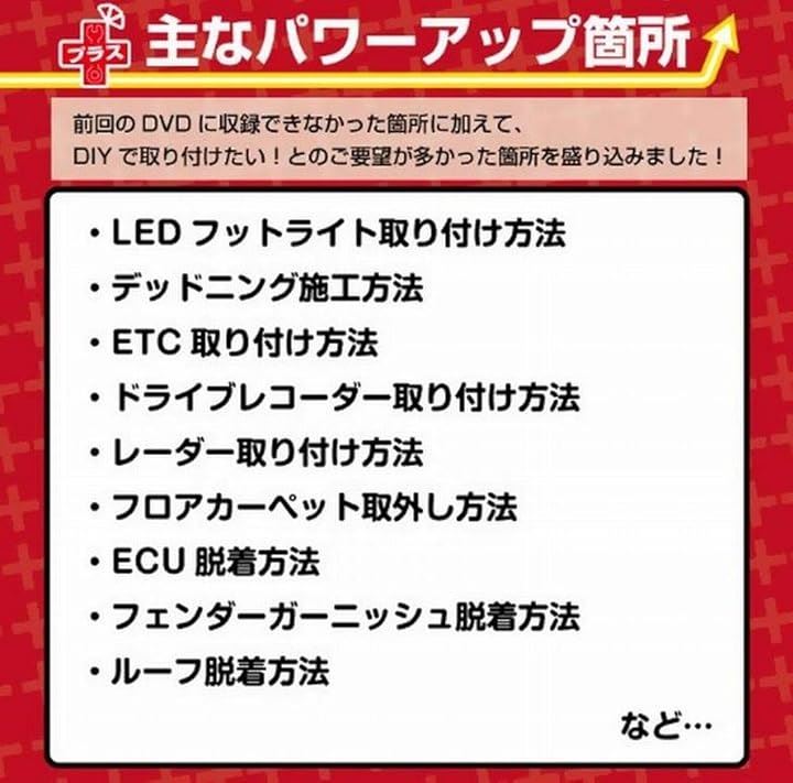 [ディスク2] 1. ECU脱着方法* 2. トランクルーム内張り脱着方法 3. リア内張り脱着方法 4. リアピラーカバー脱着方法 5. ルーフ内張り脱着方法* 6. フロアカーペット取外し方法* 7. レーダー探知機取付方法 8. 常時電源&アクセサリ電源取出し方法* 9. LEDフットランプ取付方法* 10. ETC取付方法* 11. ドライブレコーダー取付方法* 12. デッドニング施工方法* 13. スペアタイヤ交換方法* 14. バッテリー上がり対処方法*