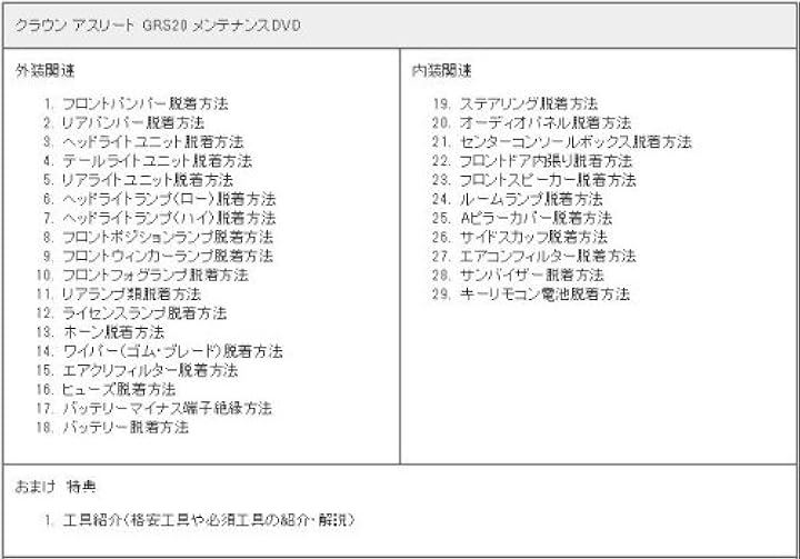 クラウンアスリート GRS200 DVD収録内容 *外装関連*1. フロントバンパー脱着方法 2. リアバンパー脱着方法 3. ヘッドライトユニット脱着方法 4. テールライトユニット脱着方法 5. リアライトユニット脱着方法 6. ヘッドライトランプ(ロー)脱着方法 7. ヘッドライトランプ(ハイ)脱着方法 8. フロントポジションランプ脱着方法 9. フロントウィンカーランプ脱着方法 10. フロントフォグランプ脱着方法 11. リアランプ類脱着方法 12. ライセンスランプ脱着方法 13. ホーン脱着方法 14. ワイパー(ゴム・ブレード)脱着方法 15. エアクリフィルター脱着方法 16. ヒューズ脱着方法 17. バッテリーマイナス端子絶縁方法 18. バッテリー脱着方法