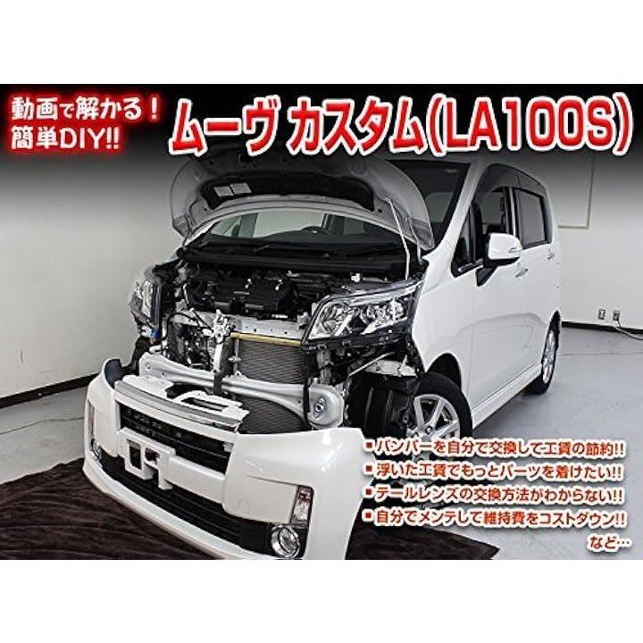 ムーヴ カスタム LA100S DVD収録内容 : 「外装編」 1.フロントバンパー脱着方法 2.リアバンパー脱着方法 3.ヘッドライトユニット脱着方法 4.テールライトユニット脱着方法 5.ヘッドライトランプ(ハイ)脱着方法 6.フロントポジションランプ脱着方法 7.フロントウィンカーランプ脱着方法 8.フロントフォグランプ脱着方法 9.リアランプ類脱着方法 10.ハイマウントストップランプ脱着方法 11.ライセンスランプ脱着方法 12.サイドミラー脱着方法 13.ホーン脱着方法 14.ワイパー(ゴム・ブレード)脱着方法 15.エアクリフィルター脱着方法 16.ヒューズ脱着方法 17.バッテリーマイナス端子絶縁方法 18.バッテリー脱着方法