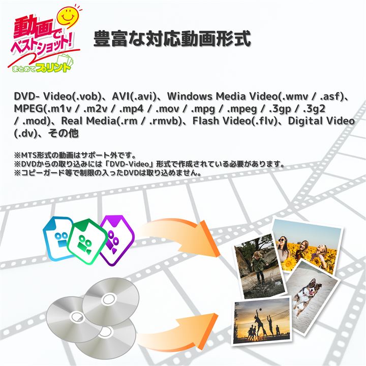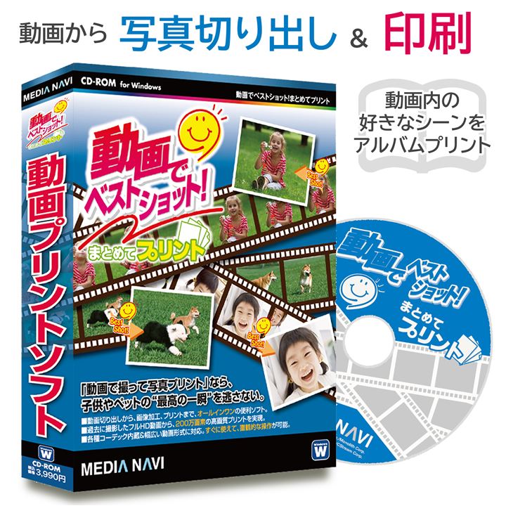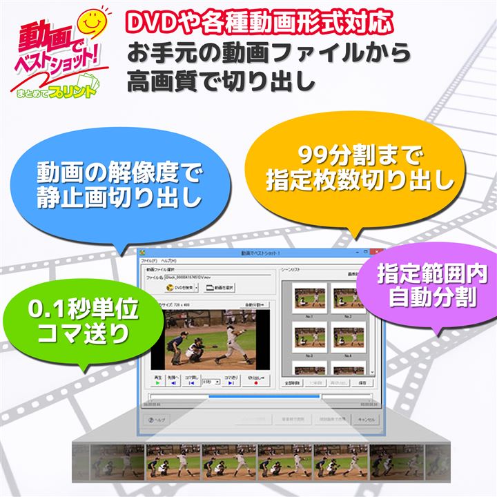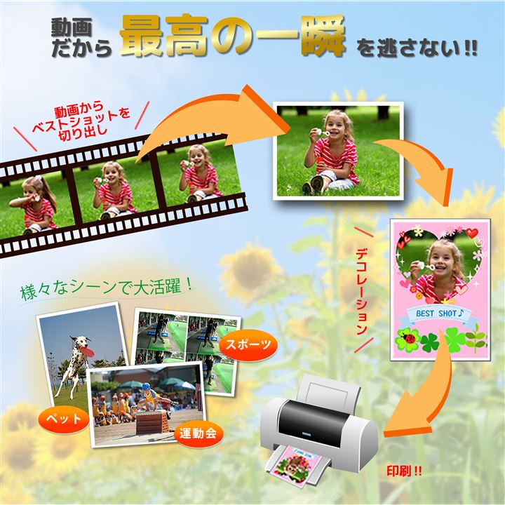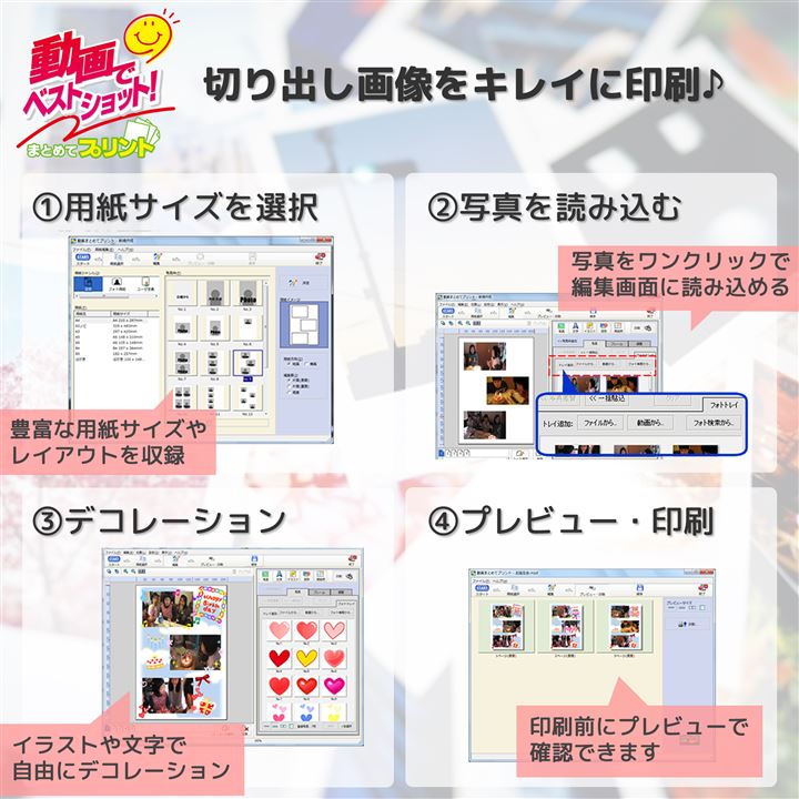 「動画でベストショット。まとめてプリント」は、動画切り出しから、画像加工、プリントまでできるオールインワンの便利ソフトです。