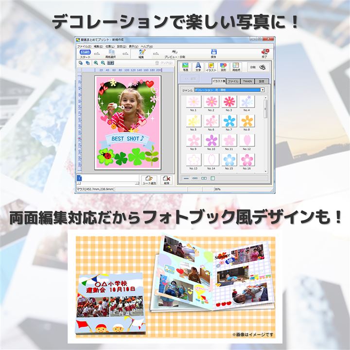 両面用紙にも対応しているので、フォトブック風のデザインもできます。