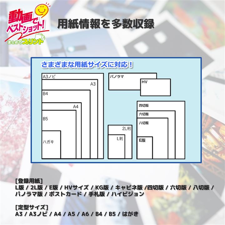 L版 / 2L版 / E版 / HVサイズ / KG版 / キャビネ版 /四切版 / 六切版 / 八切版 / パノラマ版 / ポストカード / 手札版 / ハイビジョン