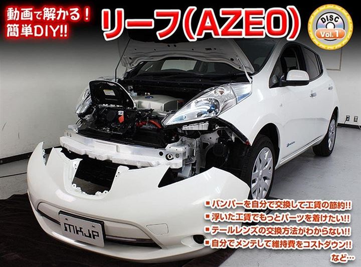 ・電球交換解説(バルブ・ウィンカーランプなど)バンパー交換方法・ヘッドライト交換方法・フロンドドア内張り脱着方法などなど、リーフ(AZE0) のメンテナンス・各種パーツ交換方法・脱着方法を解説したDVD。