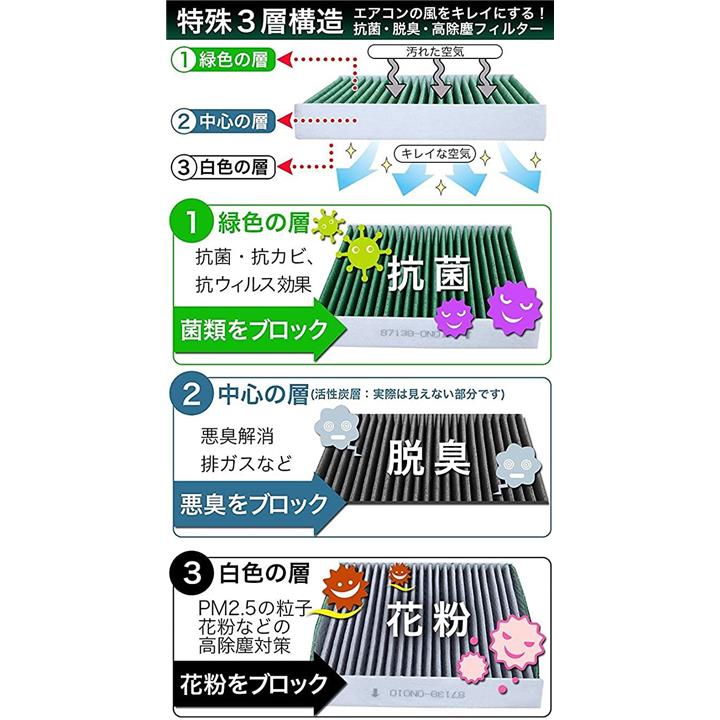 特殊3層構造活性炭入りフィルターでウィルスや排ガス、花粉やほこりを除去します。