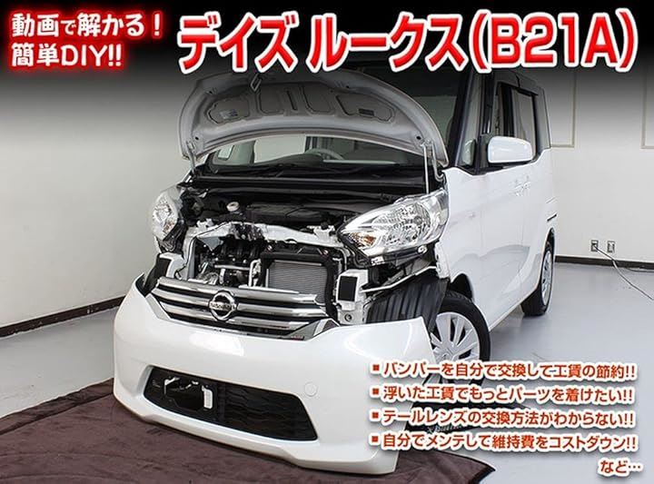 ・電球交換解説(バルブ・ウィンカーランプなど)バンパー交換方法・ヘッドライト交換方法・フロンドドア内張り脱着方法などなど、デイズ ルークス(B21A) のメンテナンス・各種パーツ交換方法・脱着方法を解説したDVD。