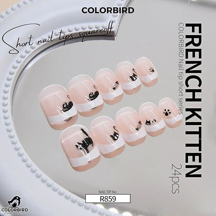 COLORBIRD ネイルチップ ショート 24枚 フレンチ 猫 白 ネイル 付け爪 チップ 短め 可愛い スクエアオフ (R859) |