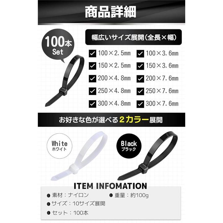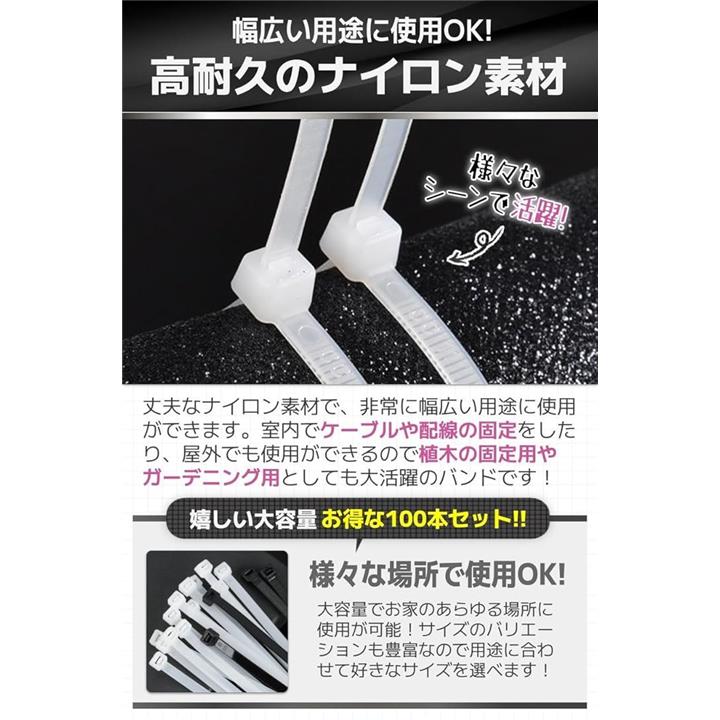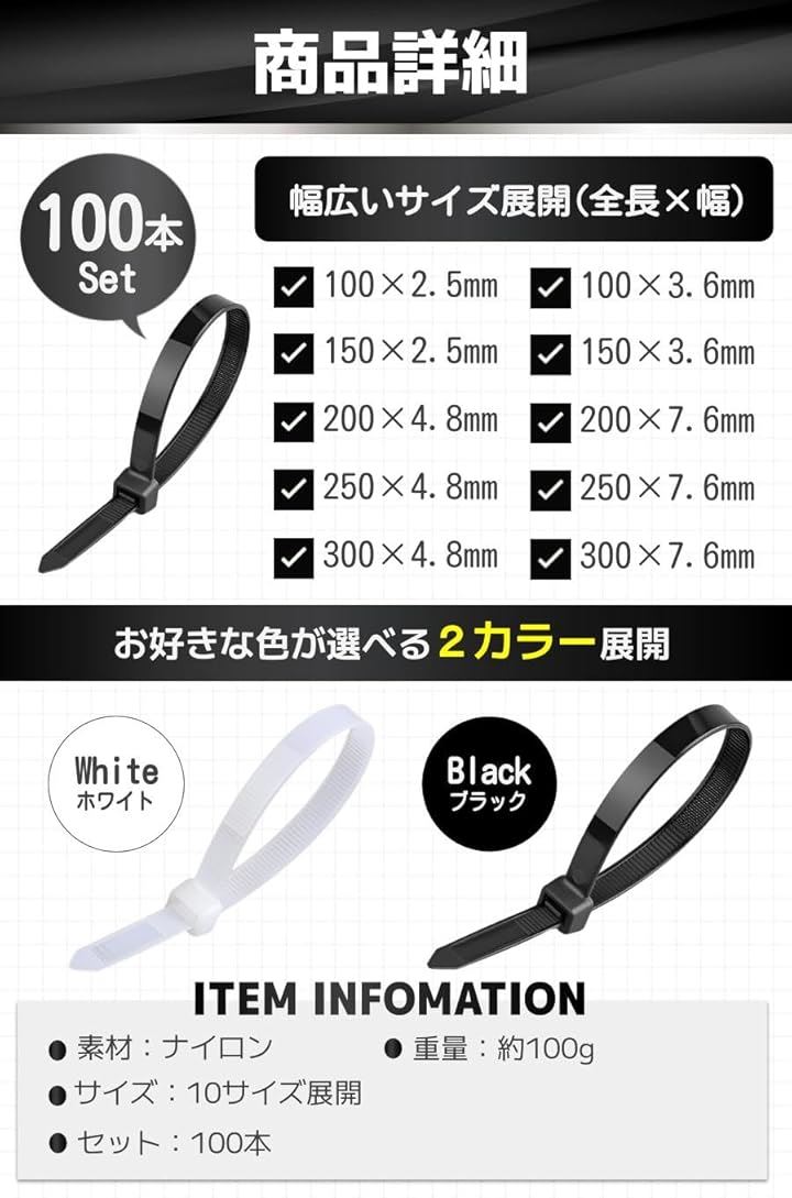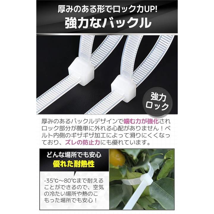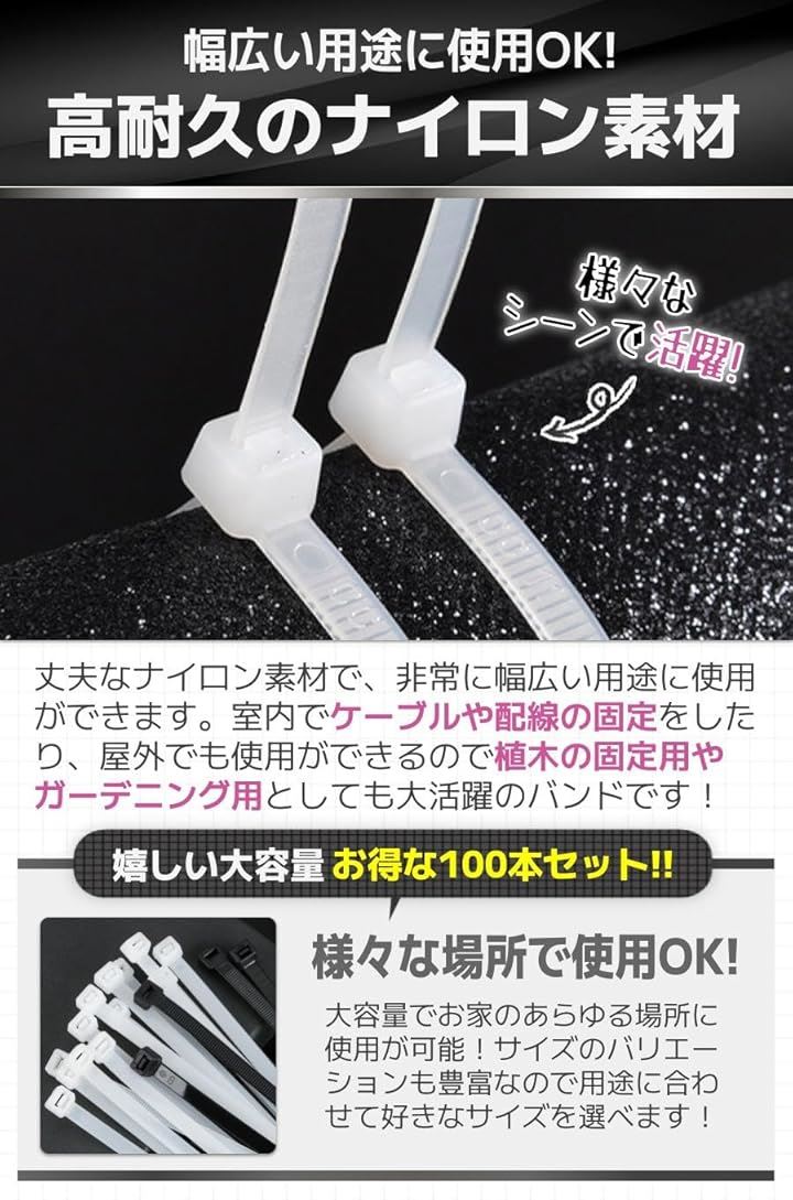 「商品特徴」(1)強力ロックで安心.:厚みのあるバックルでしっかりロック。/(2)室内・屋外使用OK:寒さや暑さにも耐性の強い素材で安心/(3)嬉しい100本セット:ご自宅のあらゆる場所に使えて嬉しい大容量/(4)豊富なサイズ展開:用途に合わせてお好きなものを選べます