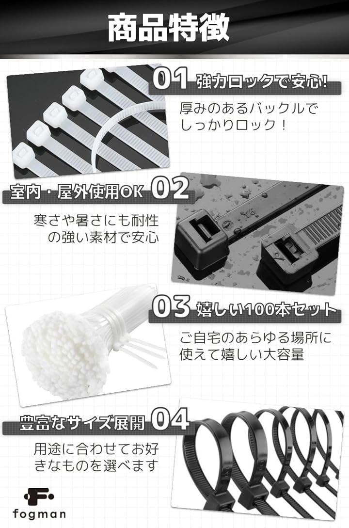 fogman 結束バンド 耐久 屋外 100本セット (300 x 4.8mm, ブラック) |