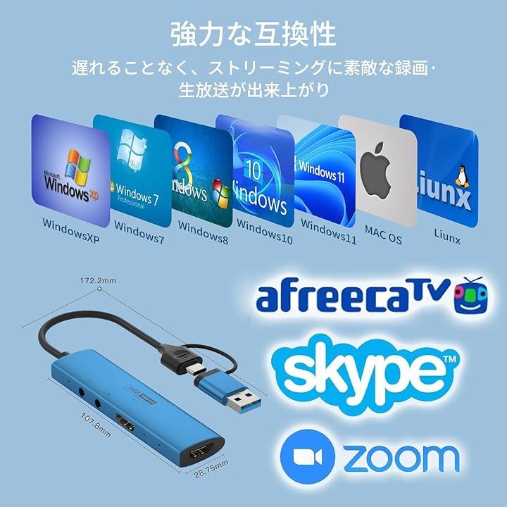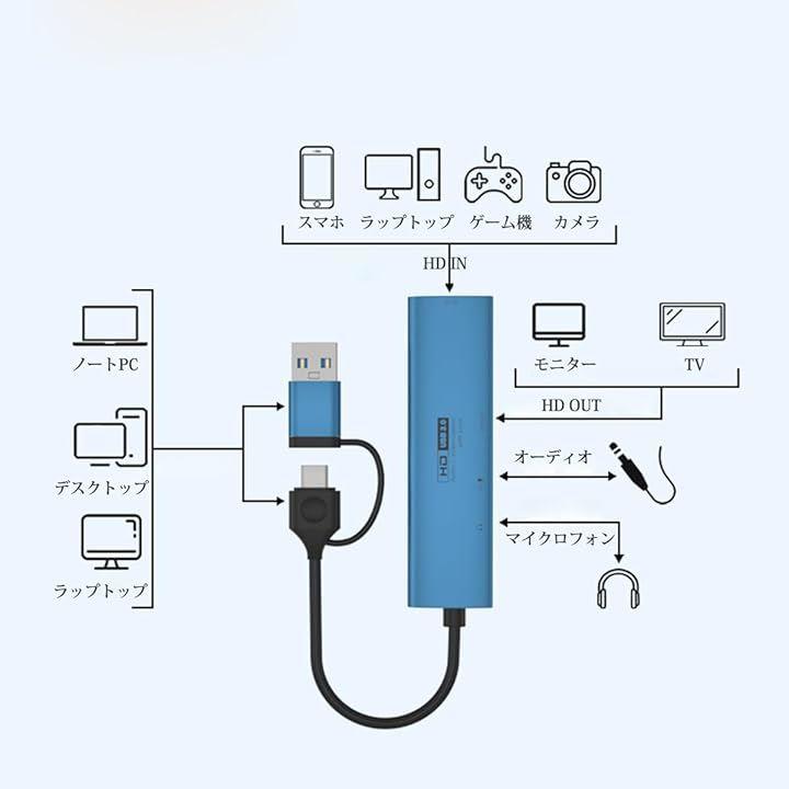 互換品HDMIキャプチャーカード USB3.0 & Type C 2in1 4K 60fps 遅延なしビデオキャプチャカード 変換 マイクと3.5mm音声出力 Windows/Linux/Mac OS X/PS4/Xbox One/Switch/OBS Studio対応