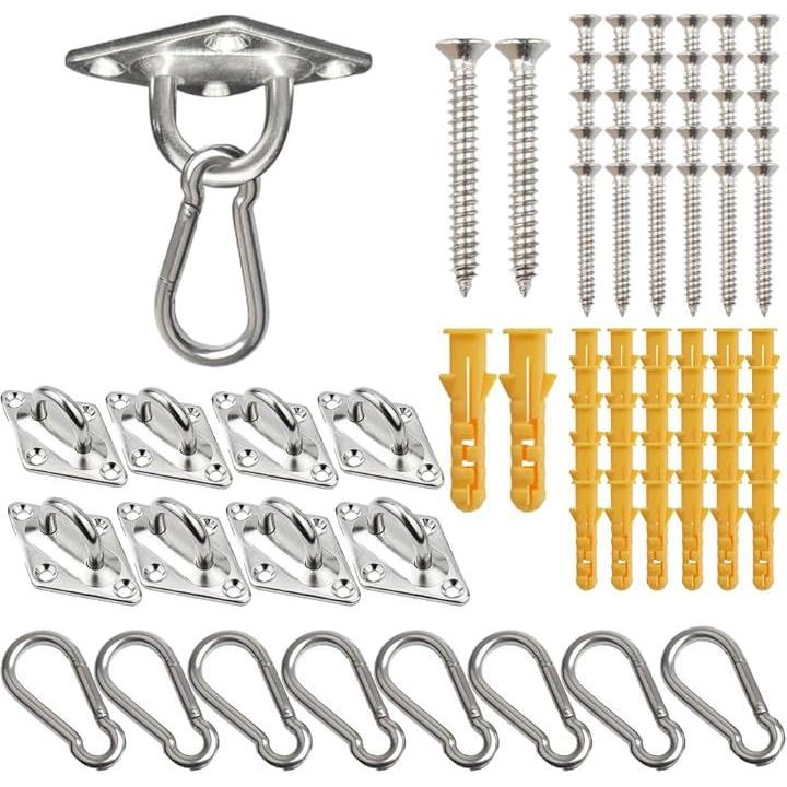 手間いらずのアイプレートキットで、自由自在の楽しみが広がります」この天井フックキットには、アイプレート、カラビナ、ネジ、アンカープラグが必要数含まれています。