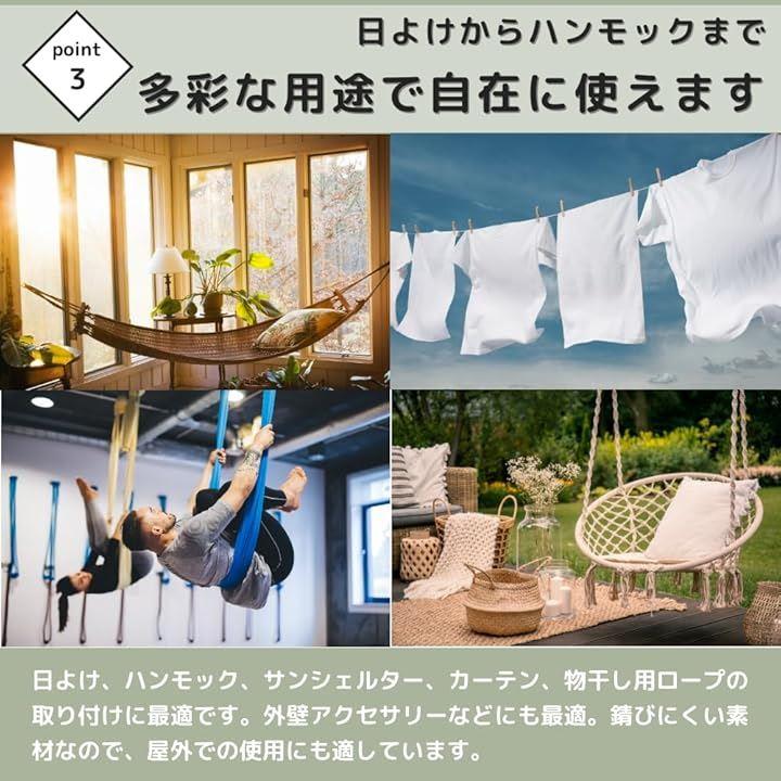 日よけ、証明、ハンモック、サンシェルター、カーテン、物干し用ロープの取り付けに最適です。