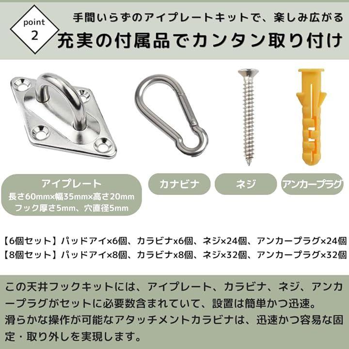 「付属品とアクセサリー」この天井フックキットには、アイプレート、カラビナ、ネジ、アンカープラグが必要数分含まれています。
