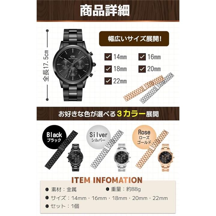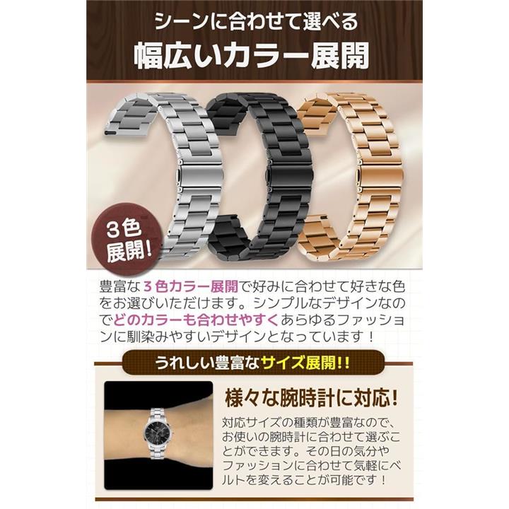 「商品特徴」(1)男女兼用のデザイン:シンプルなデザインで男女問わず使用可能/(2)幅広い対応サイズ:お使いの時計に合うサイズが見つかる/(3)高級感のある素材:光沢のある金属素材で高級感を演出。/(4)豊富なカラー展開:お洋服やお好みに合わせて選べる
