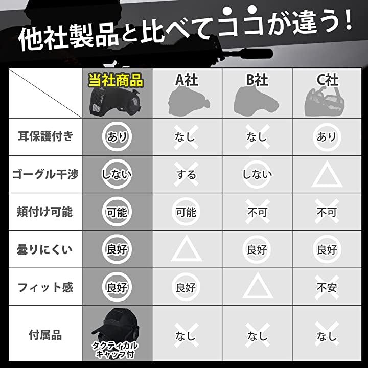 ・v「耳保護」耳部分にも高耐久スチールを採用しており、耳部分の被弾もしっかりガードしてくれる為、安心してサバゲーをお楽しみ頂けます。