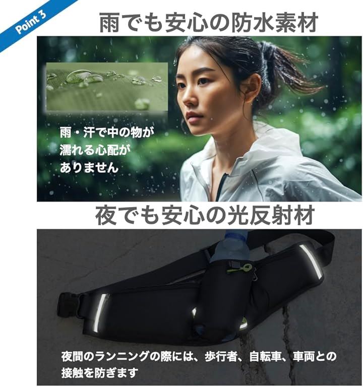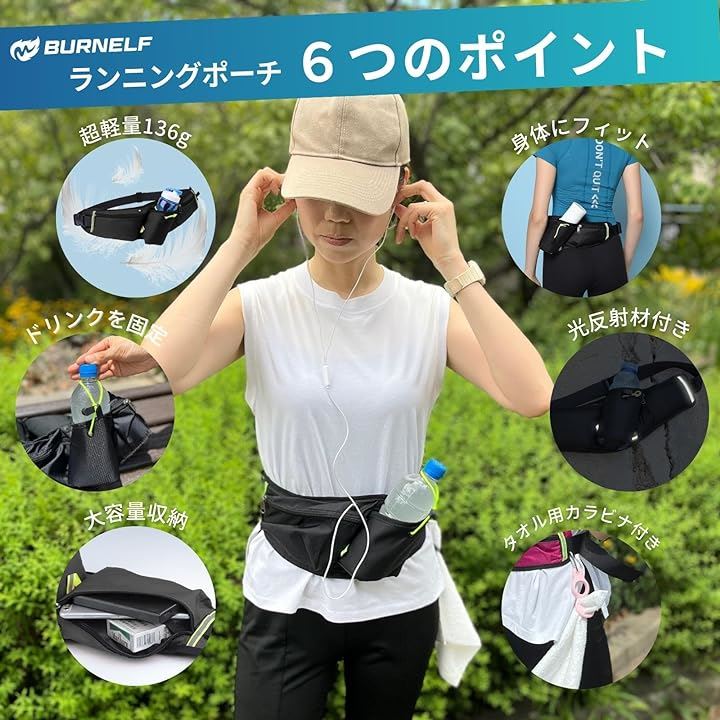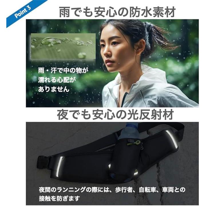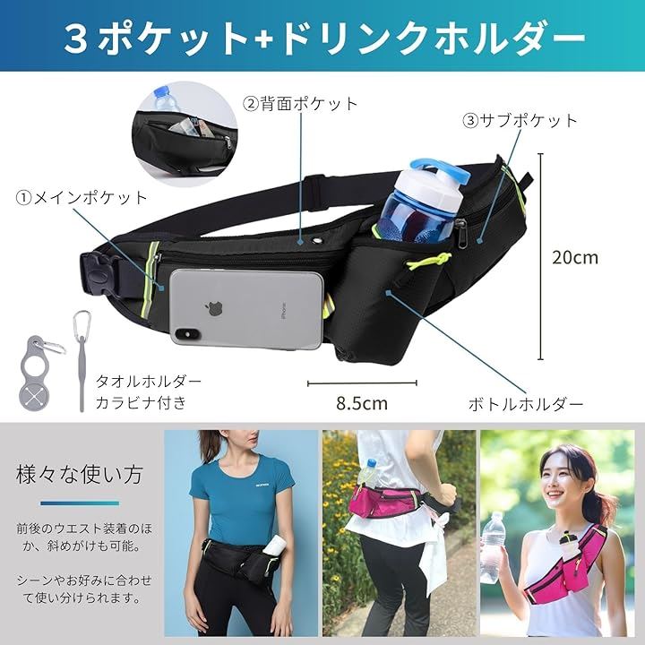 ランニングホ゜ーチ スリム ウエストポーチ 軽量 防水 薄型 大容量 揺れない 光反射材 スマホ 対応 メンズ レディース カラビナ付(ブラック) |
