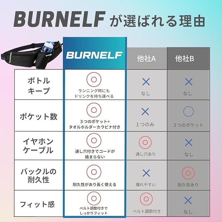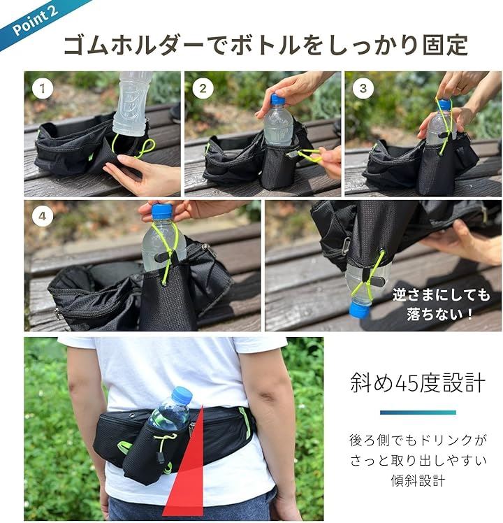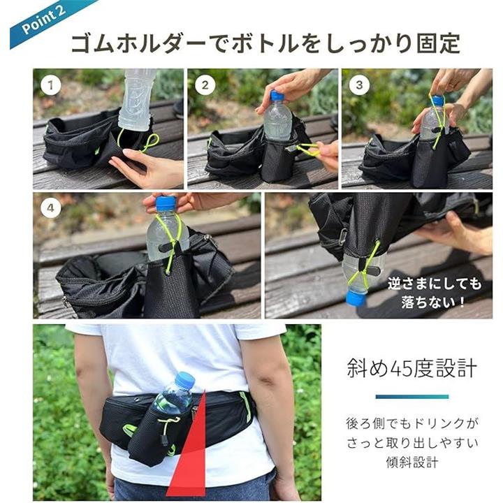 又、ボトルホルダーが45°傾斜している設計なので取り出しやすさに特化していて長時間のジョギングでも快適に走る事ができるランニングポーチです。