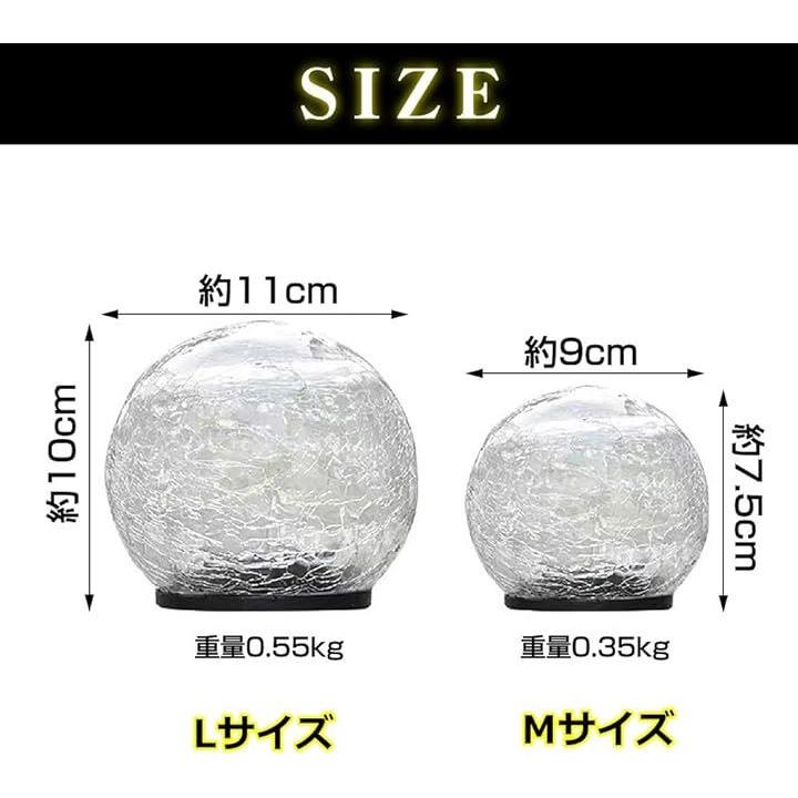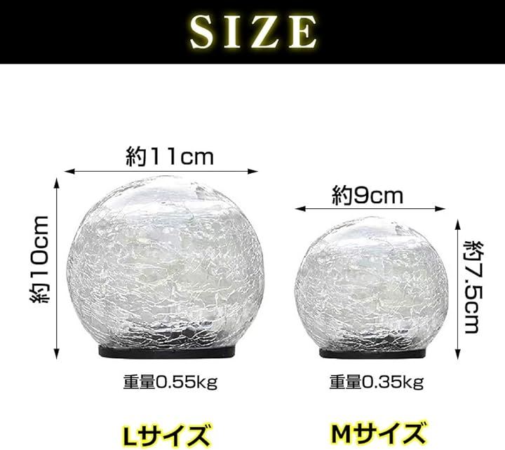 仕様:サイズM(サイズ:約9x9x7.5cm 個数:1個 素材:ガラス、ABS 灯数:LED銅線ライト20個 バッテリー:Ni-MH600mah、充電時間:7時間以上 連続作動時間:6~8時間)、サイズL(サイズ:約11x11x10cm 個数:1個 素材:ガラス、ABS 灯数:LED銅線ライト30個 バッテリー:Ni-MH600mah、充電時間:7時間以上 連続作動時間:6~8時間)*モニターの環境により、色の見え方に若干差が生じる場合がございます。