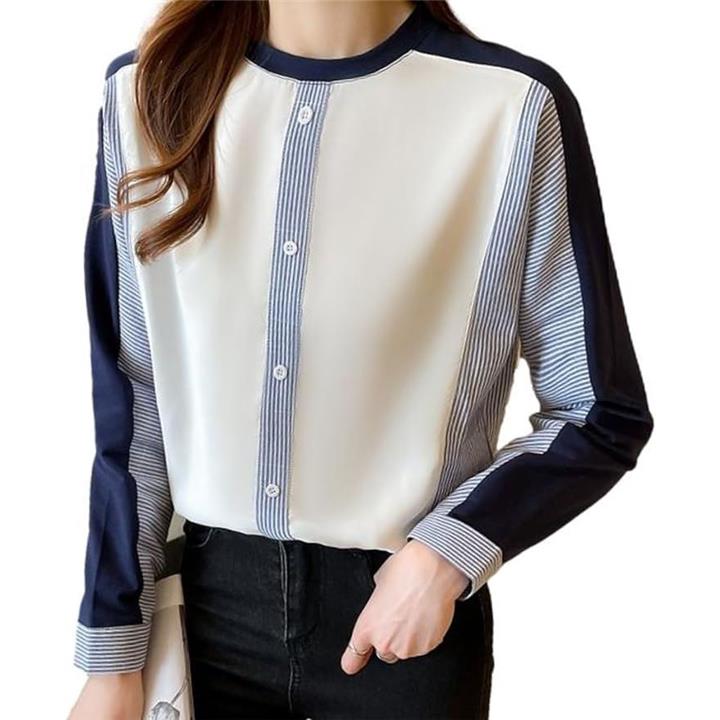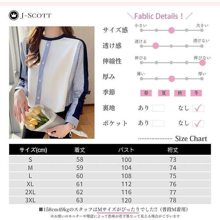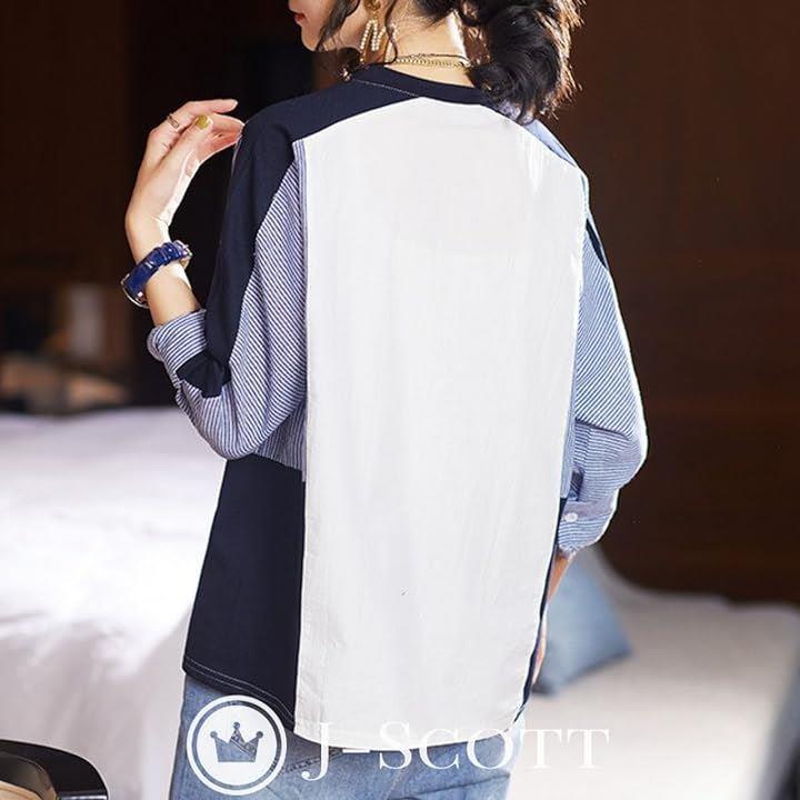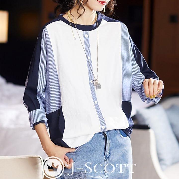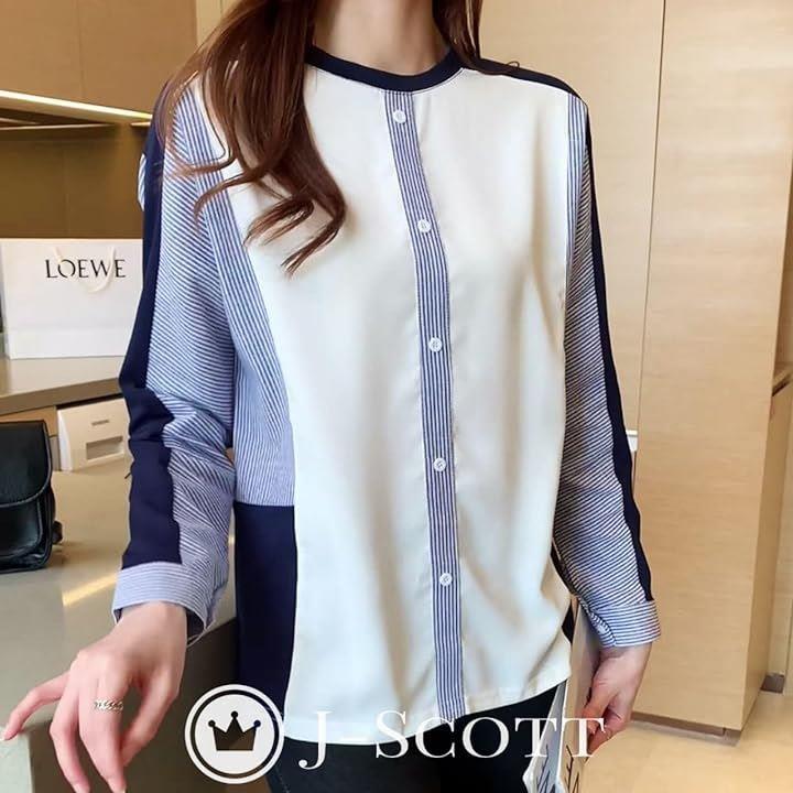 異素材ドッキングトップス ストライプ 飾りボタン プルオーバー 大人カジュアル 長袖