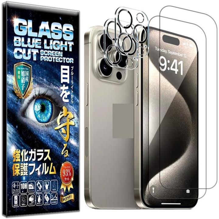 RISE 2枚+2枚 フィルム iPhone 15 Pro Max ガラスフィルム ブルーライトカット カメラフィルム レンズフィルム レンズ保護ガラス レンズカバー