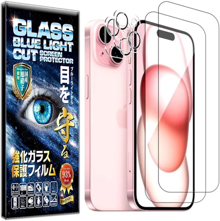 2枚+2枚 フィルム iPhone 15 ガラスフィルム ブルーライトカット カメラフィルム レンズフィルム レンズ保護ガラス レンズカバー 保護フィルム 強化 高透過 高光沢 日本製