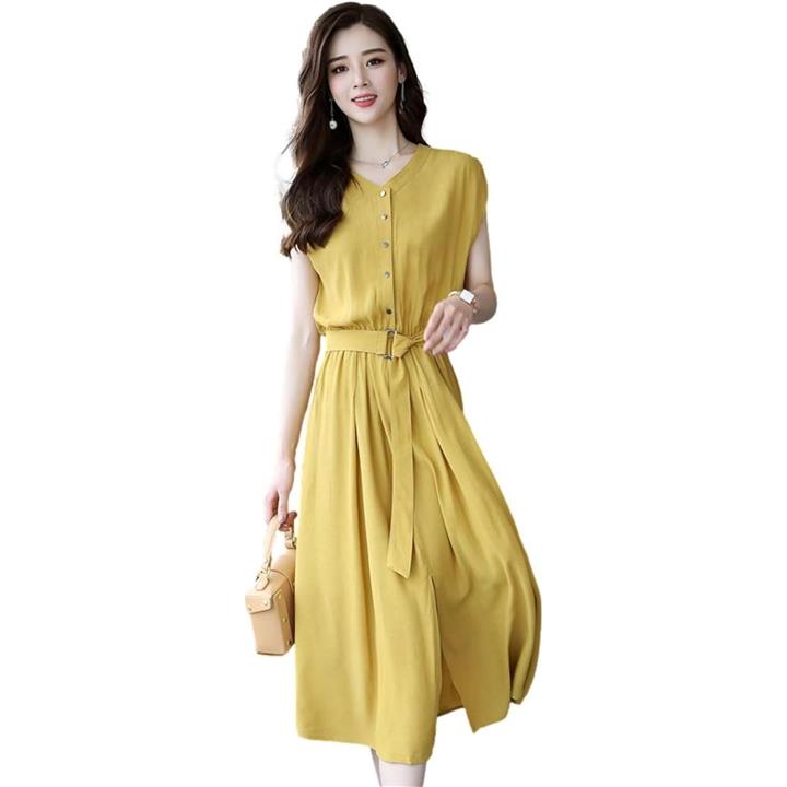 [blue beryl] ワンピース レディース Aライン ミモレ丈 ウエストベルト シフォン フレンチスリーブ ノーカラー BB003 |