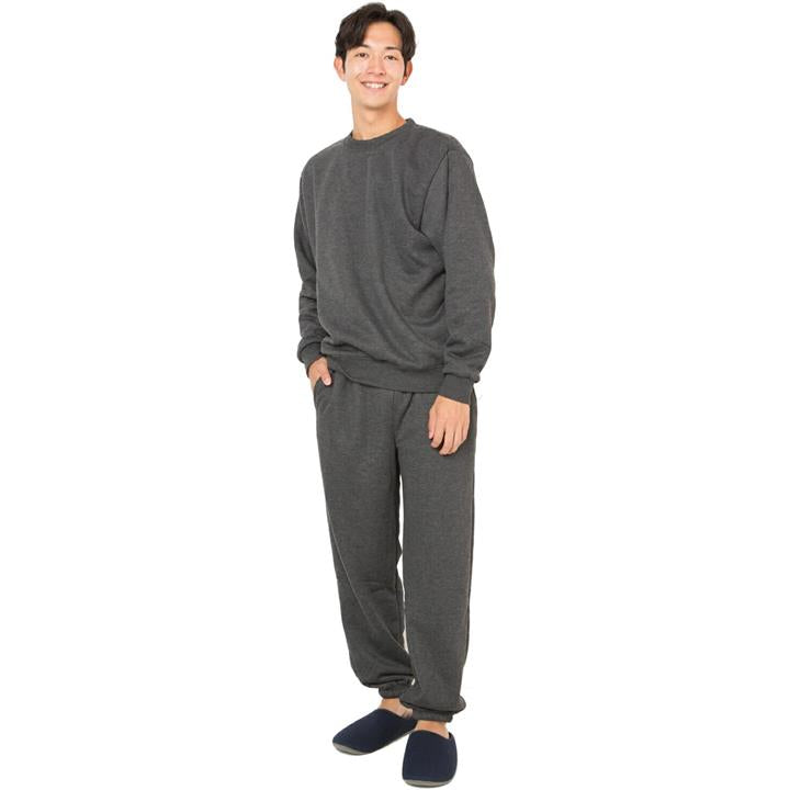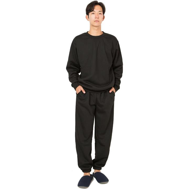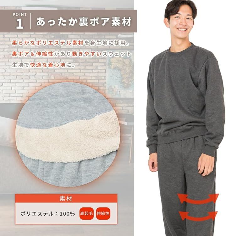 寒い季節に裏ボア素材を使用した、暖かくて動きやすいトレーナーとパンツの上下セット。