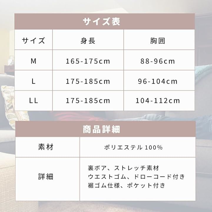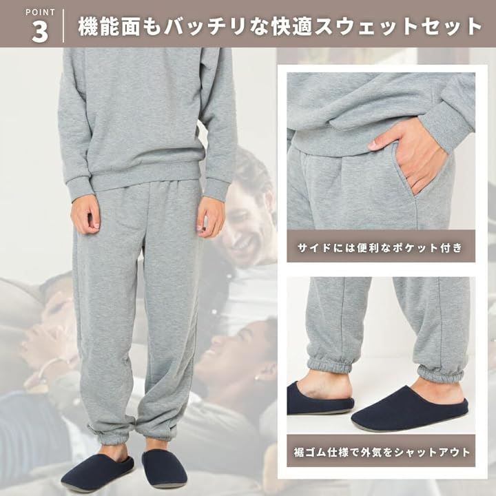 「寒い季節のルームウェアやパジャマに」 このスウェットセットアップは、裏ボア素材を採用しており、寒い季節にぴったりのルームウェアやパジャマとして活躍。