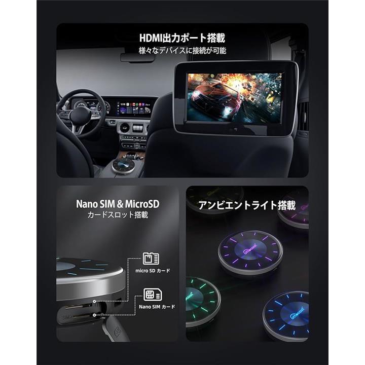 互換品Ottocast オットキャスト P3 CarPlay AI Box Android 12アタブター nano SIMカード/Micro SDカードスロット HDMI出力端子搭載 前席後席で動画視聴可能技適取得済み品