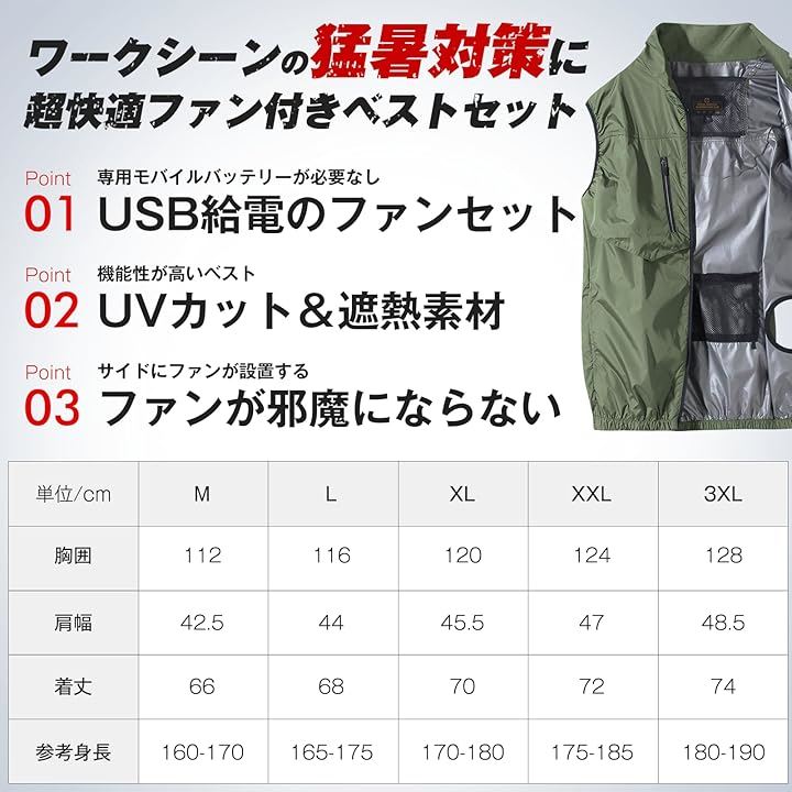 ファン付きベスト ファンバッテリーセット USB給電 扇風機付きベスト 涼しい作業服 大風量 3段階調節 薄型ファン 超軽量 熱中症予防 猛暑対策 空調作業着セット