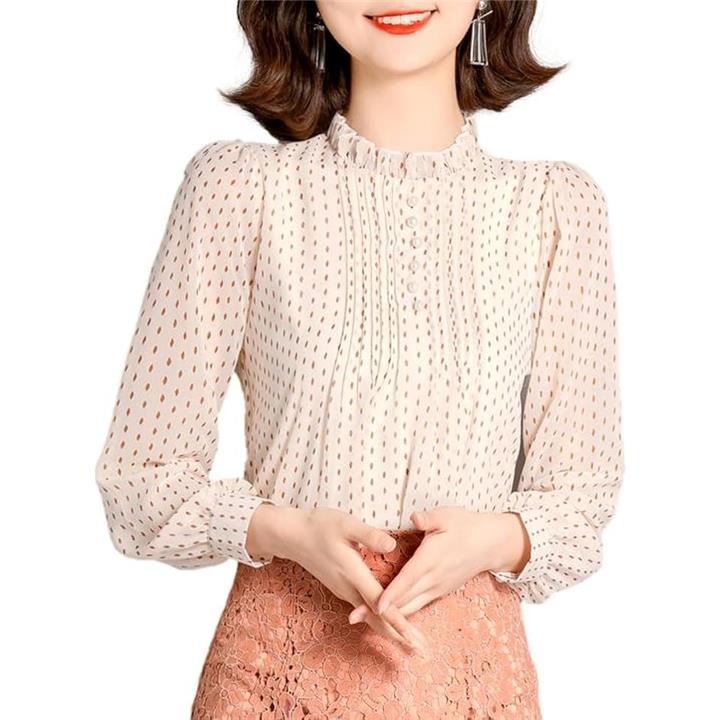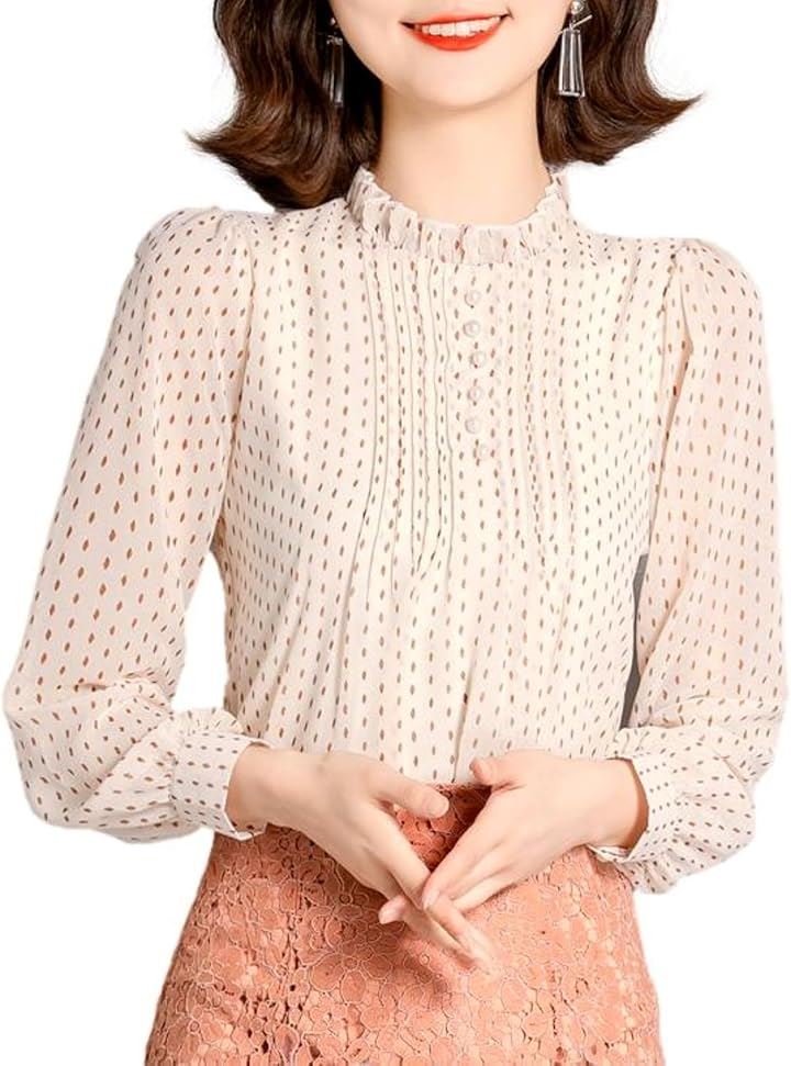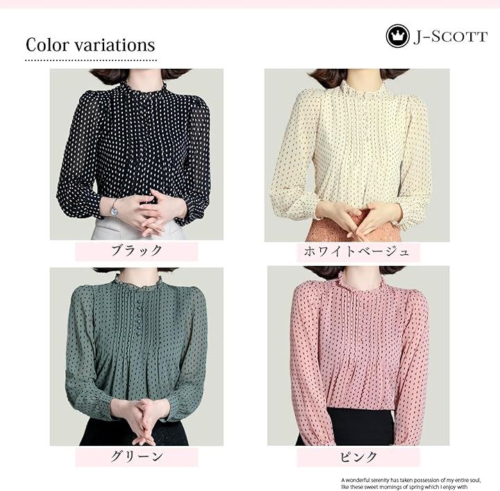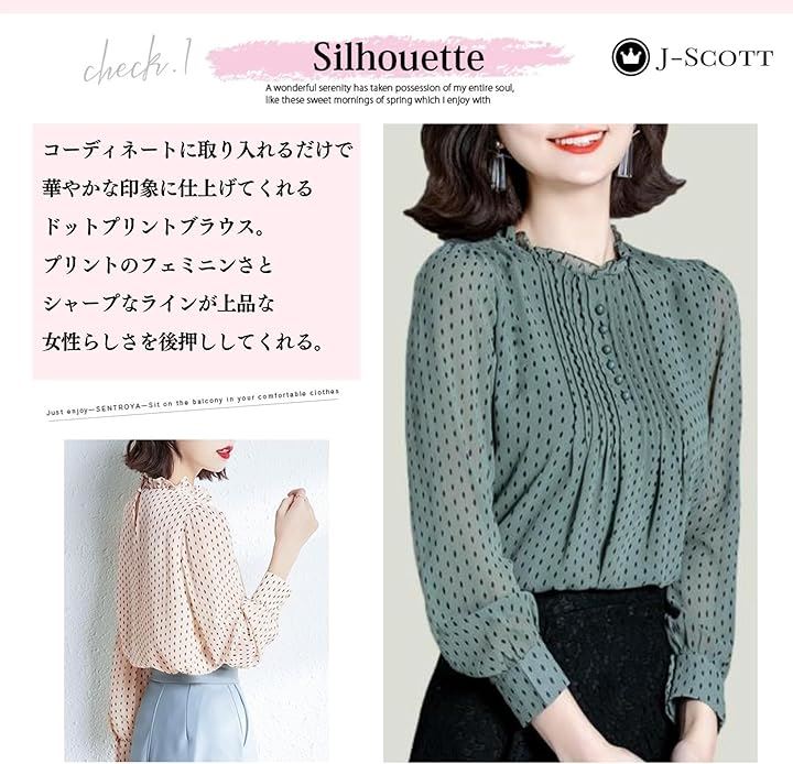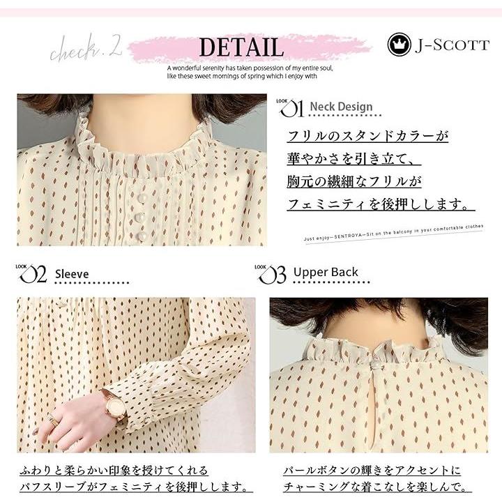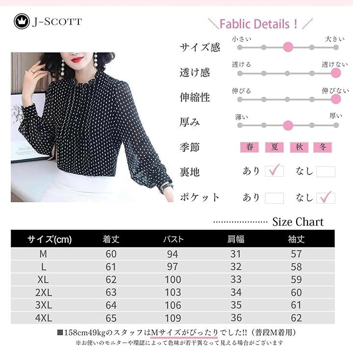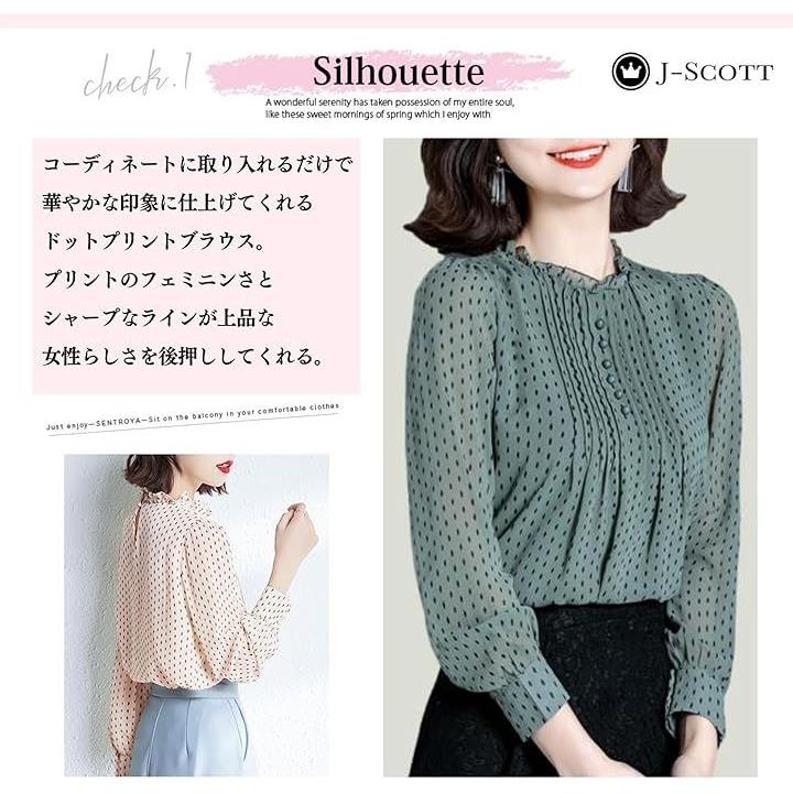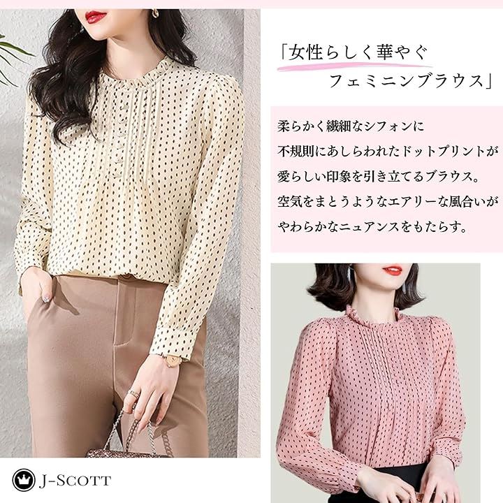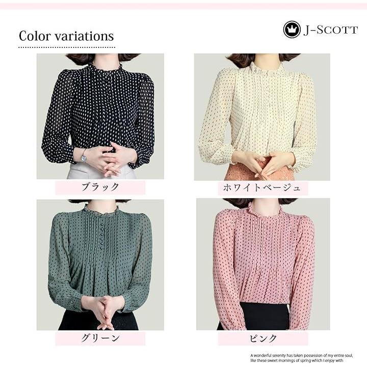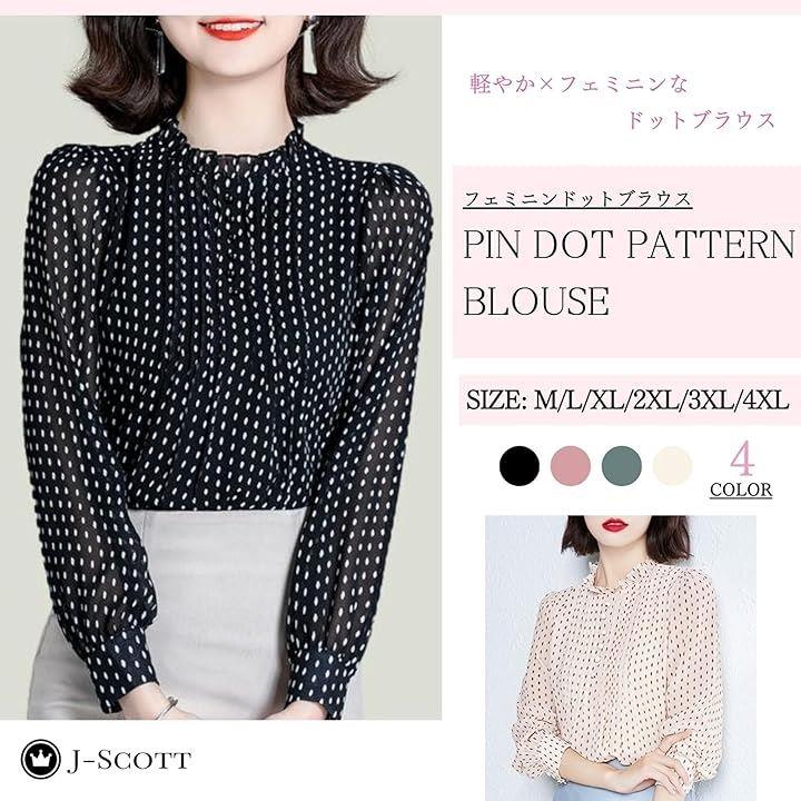 ドット柄フェミニンブラウス パールボタン フリルネック 長袖 裏地あり シフォン素材 ワーク 小さいサイズ 衣装 リモート 仕事着 服 3XL M 春用 通勤 ふんわり 旅行 合唱 裏地有り JS58